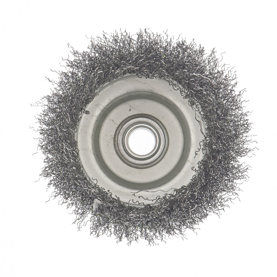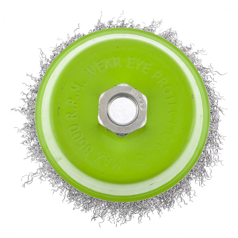 Щетка для УШМ Сибртех «чашка» 746057, М14, диаметром 100 мм, с щетиной из витой проволоки 0,3 мм, предназначена для постепенного снятия тонкого слоя материала с металлических, деревянных и пластиковых поверхностей. Удаляет ржавчину, загрязнения, а также остатки краски и других покрытий. Подходит для обработки участков значительной площади. Щетку устанавливают на вал углошлифовальной машины (УШМ), рекомендуемая максимальная скорость вращения 8500 об/мин. Работать с оснасткой следует в спецодежде.