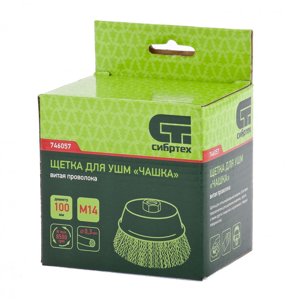 <p>Щетка для УШМ Сибртех «чашка» 746057, М14, диаметром 100 мм, с щетиной из витой проволоки 0,3 мм, предназначена для постепенного снятия тонкого слоя материала с металлических, деревянных и пластиковых поверхностей. Удаляет ржавчину, загрязнения, а также остатки краски и других покрытий. Подходит для обработки участков значительной площади. Щетку устанавливают на вал углошлифовальной машины (УШМ), рекомендуемая максимальная скорость вращения 8500 об/мин. Работать с оснасткой следует в спецодежде.</p><h2>Преимущества</h2><ul><li>Деформационная стойкость щетины — витая проволока принимает исходную форму после снятия нагрузок.</li><li>Защита от коррозии — корпус покрыт эмалью, а на щетину нанесено техническое масло.</li><li>Быстрая установка и замена насадки — щетка крепится на вал УШМ при помощи гайки М14.</li></ul>