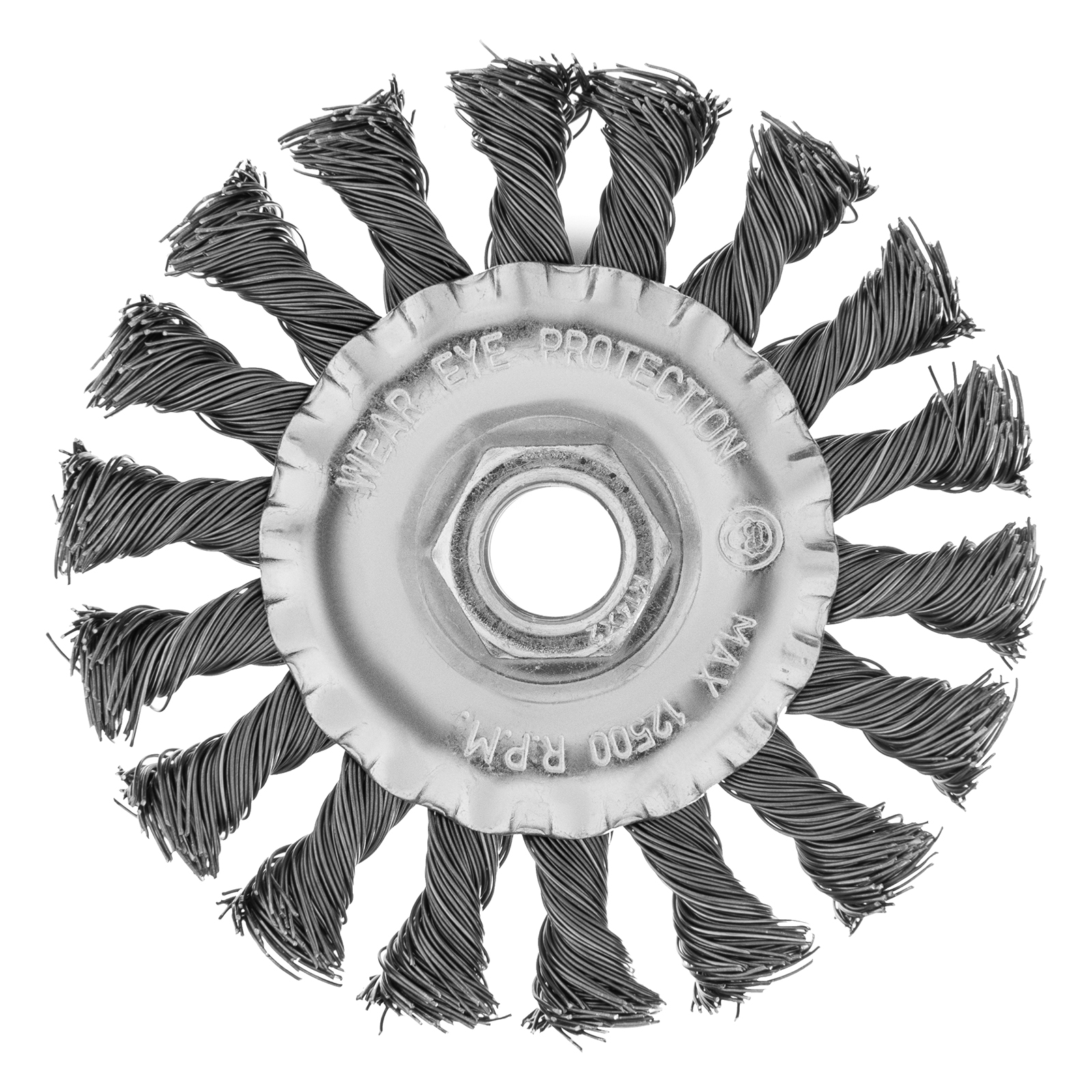 Плоская щетка Matrix 74639 диаметром 100 мм, с щетиной из крученой проволоки толщиной 0,5 мм и гайкой М14, — оснастка для УШМ, предназначенная для грубой (черновой) обработки поверхностей. Максимально допустимая скорость вращения шпинделя — 12500 об/мин. Щетка позволяет снять толстый слой ржавчины, лакокрасочных покрытий, загрязнений, а также зачистить сварные швы. Плоская форма удобна для обработки углов, изгибов и других труднодоступных мест.