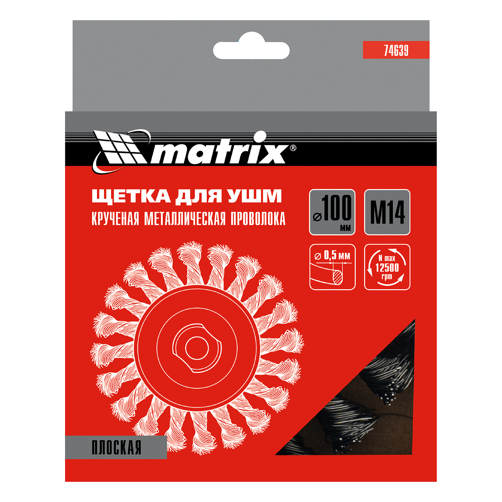 <p>Плоская щетка Matrix 74639 диаметром 100 мм, с щетиной из крученой проволоки толщиной 0,5 мм и гайкой М14, — оснастка для УШМ, предназначенная для грубой (черновой) обработки поверхностей. Максимально допустимая скорость вращения шпинделя — 12500 об/мин. Щетка позволяет снять толстый слой ржавчины, лакокрасочных покрытий, загрязнений, а также зачистить сварные швы. Плоская форма удобна для обработки углов, изгибов и других труднодоступных мест.</p><h2>Преимущества</h2><ul><li>Долговечность — щетина из высококачественной стальной проволоки устойчива к износу.</li><li>Универсальность — щетка подходит для обработки любых твердых поверхностей: из металла, древесины, цветных металлов, пластика и т. д.</li><li>Стойкость к разрушению — корпус оцинкован, а щетина покрыта техническим маслом для защиты от коррозии.</li></ul>