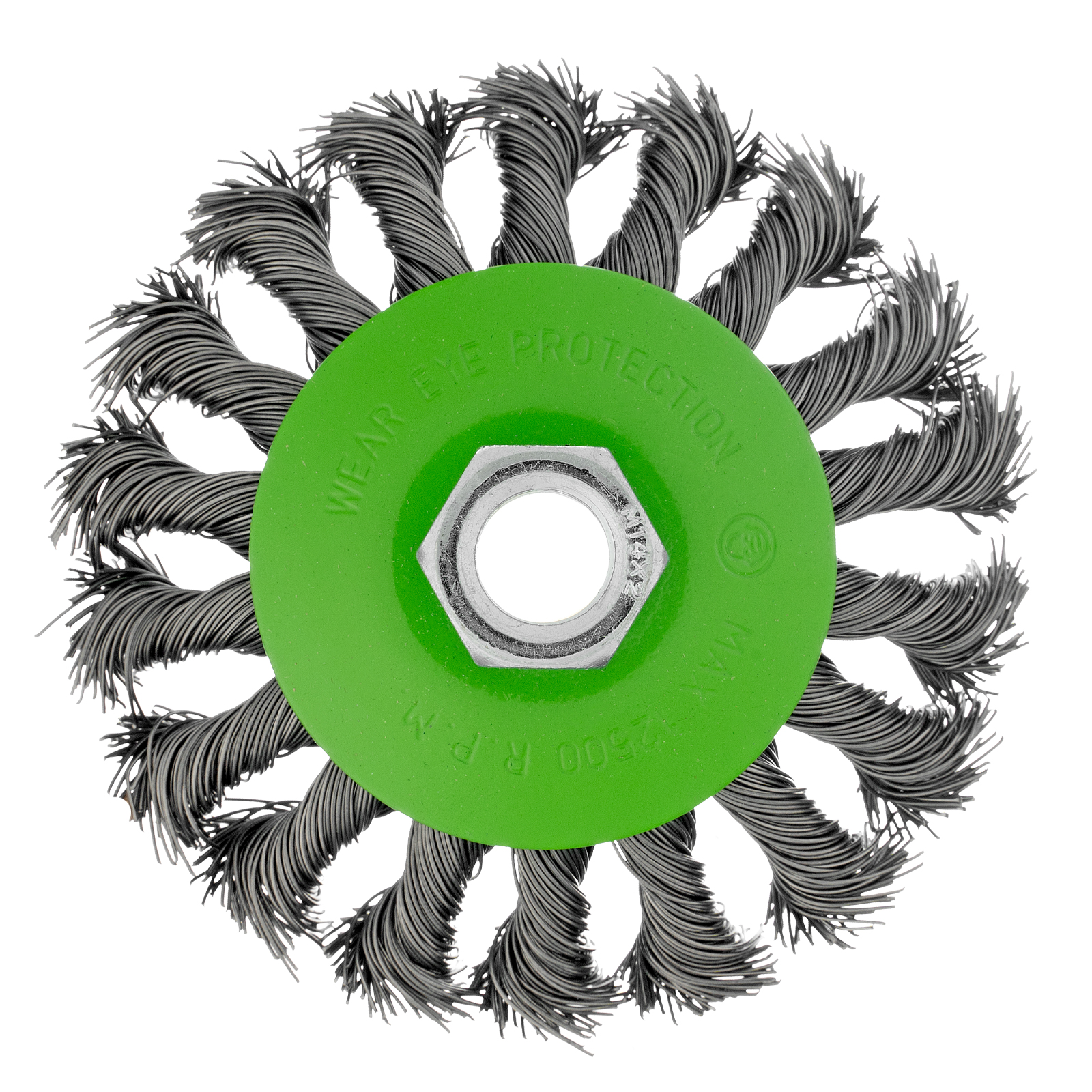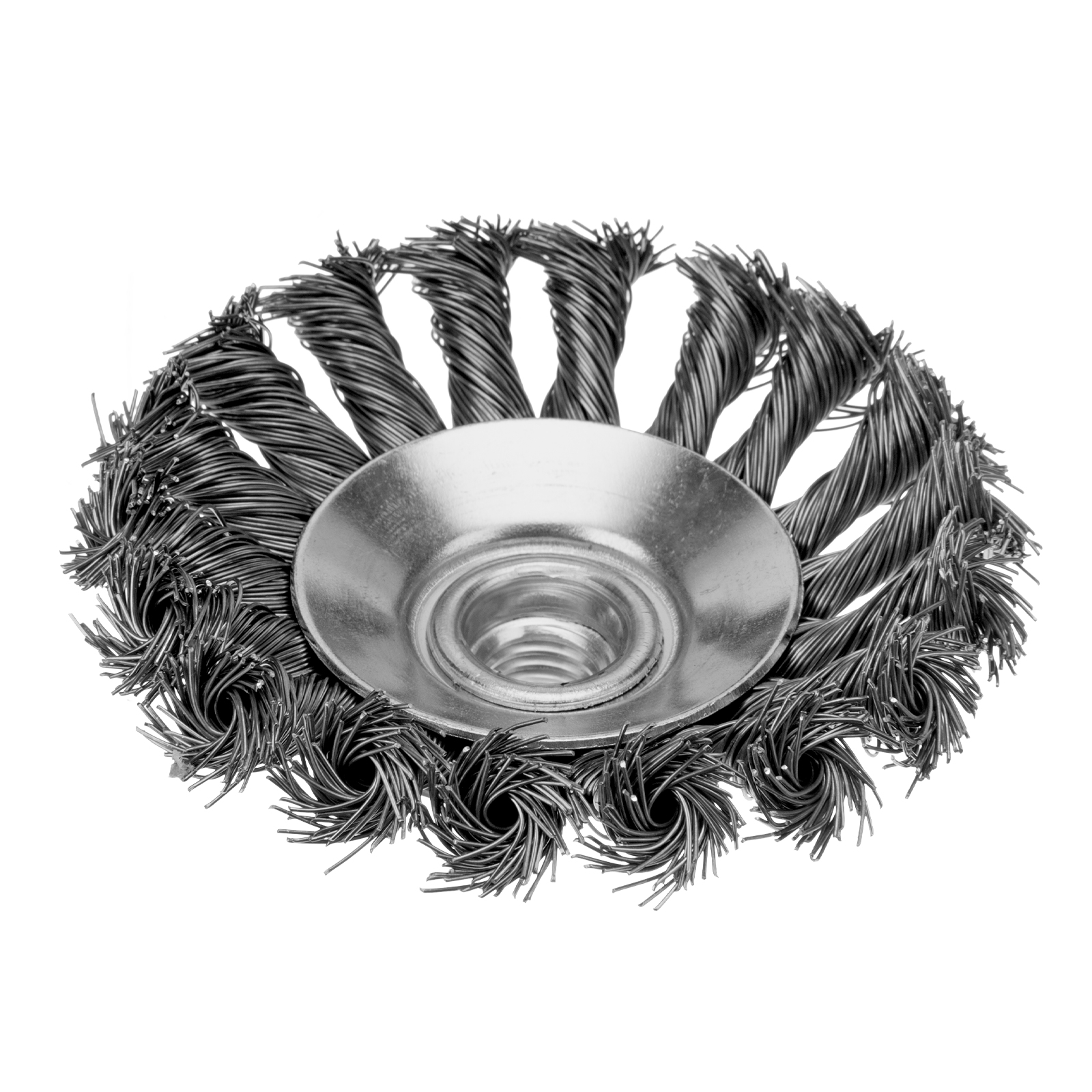Щетка Сибртех «тарелка» 746097 диаметром 100 мм, с щетиной из крученой проволоки толщиной 0,5 мм, устанавливается на УШМ при помощи гайки М14. Выполнена в форме тарелки, за счет чего подходит для грубой (черновой) обработки плоских и угловых поверхностей. Удаляет ржавчину, загрязнения, лакокрасочные покрытия, подходит для зачистки сварных швов. Использование на скорости до 12500 об/мин позволяет продлить срок службы насадки.