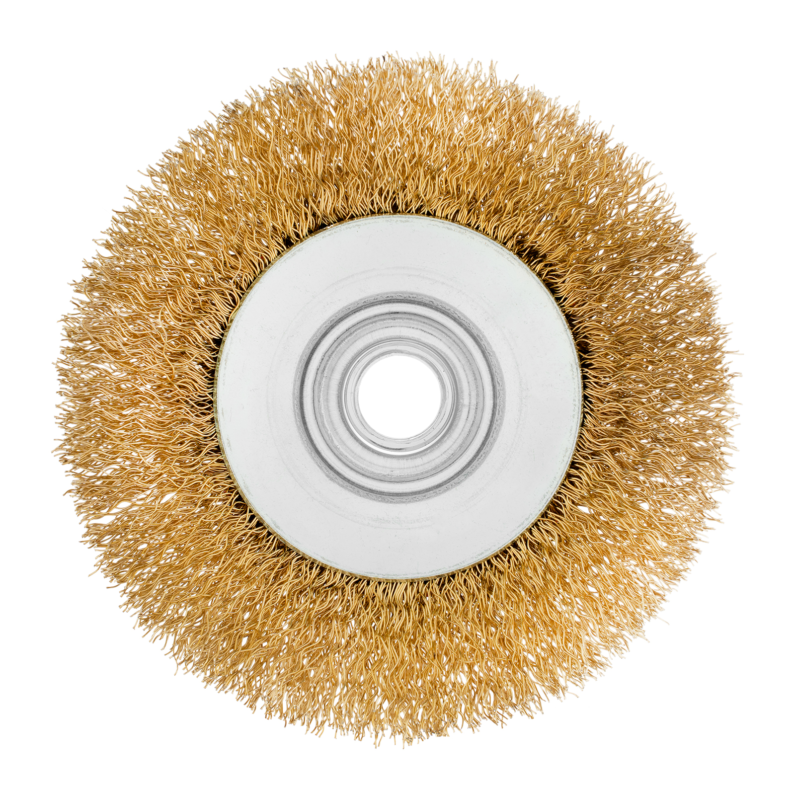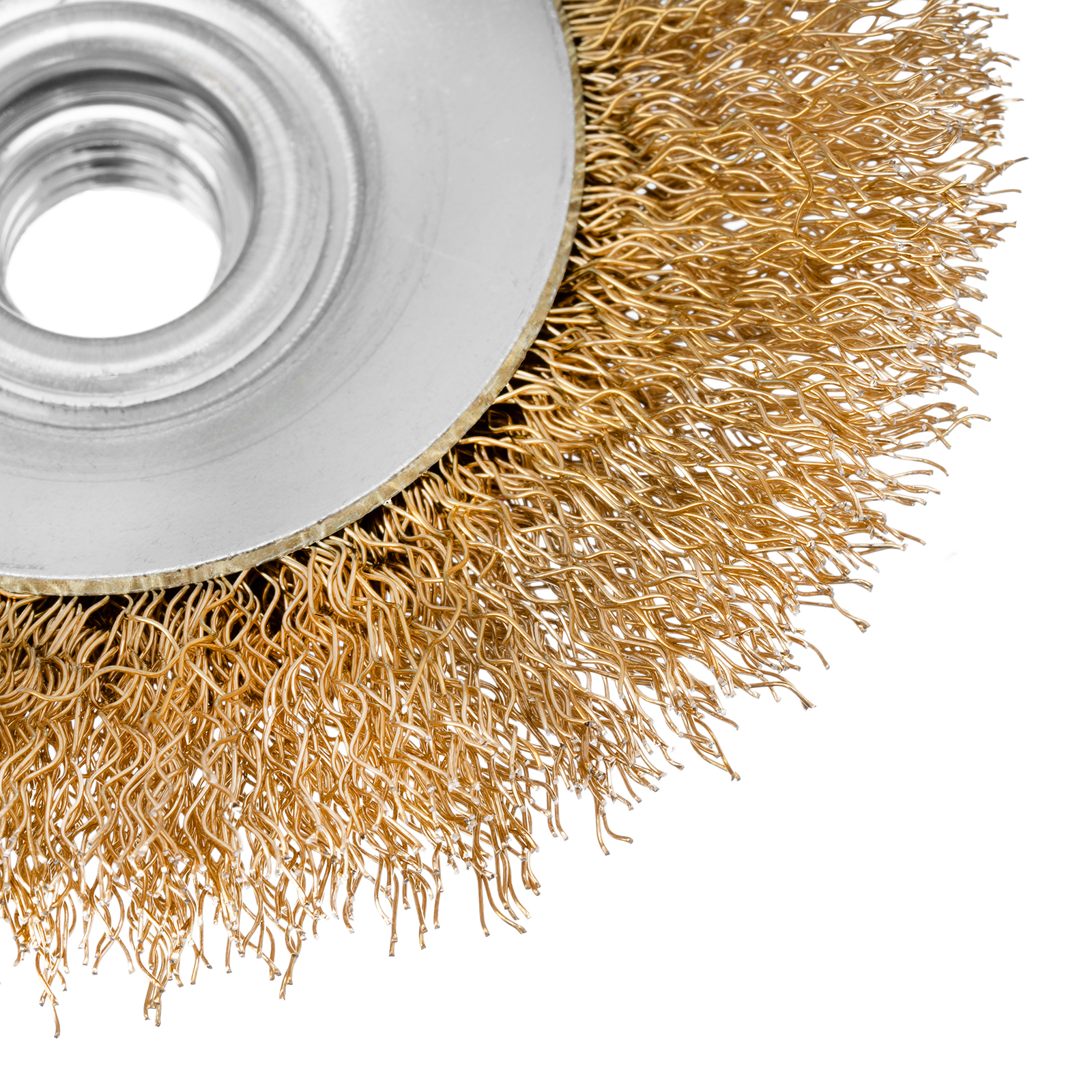 Щетка Matrix «тарелка» 74608 диаметром 100 мм, с щетиной из латунированной витой проволокой и гайкой М14,— насадка для УШМ, использующаяся для удаления с поверхностей ржавчины и загрязнений, старого слоя ЛКМ. Рекомендованная скорость вращения — не более 12500 об/мин. Щетка является универсальным инструментом, позволяющим обрабатывать как большие плоские поверхности, так и углы.