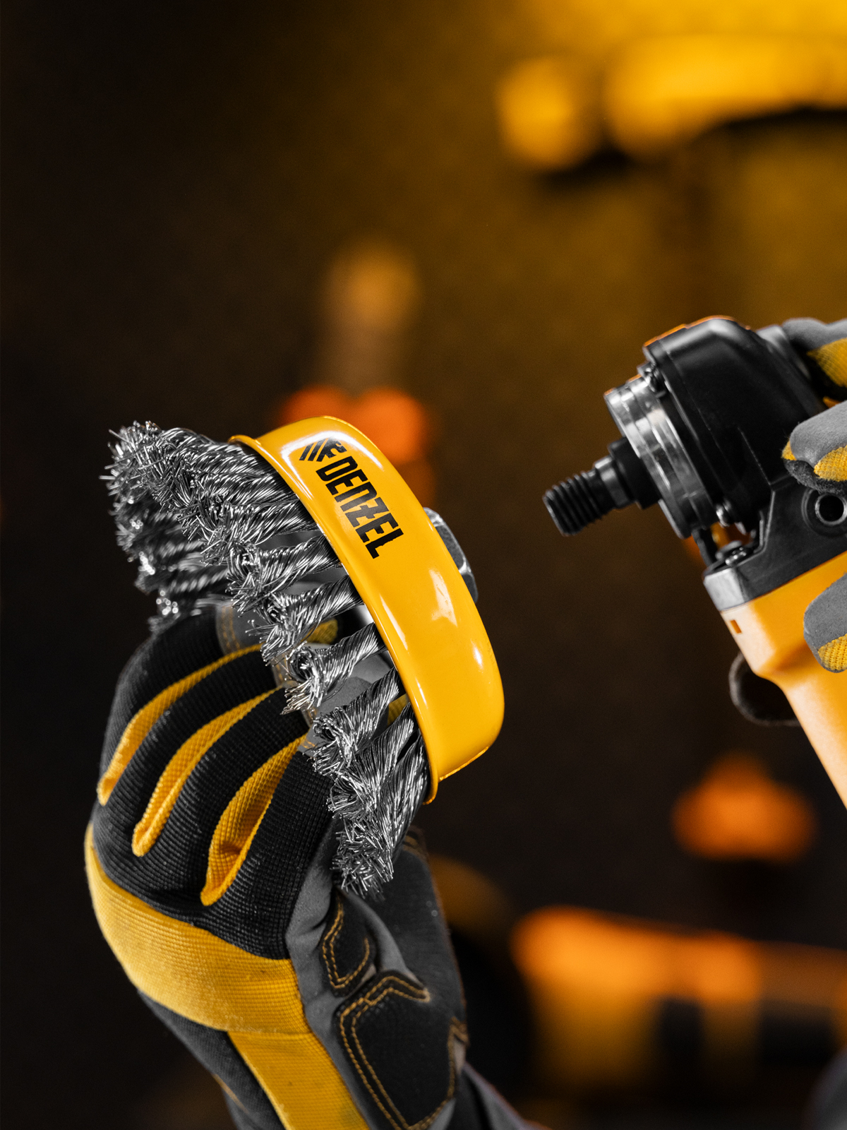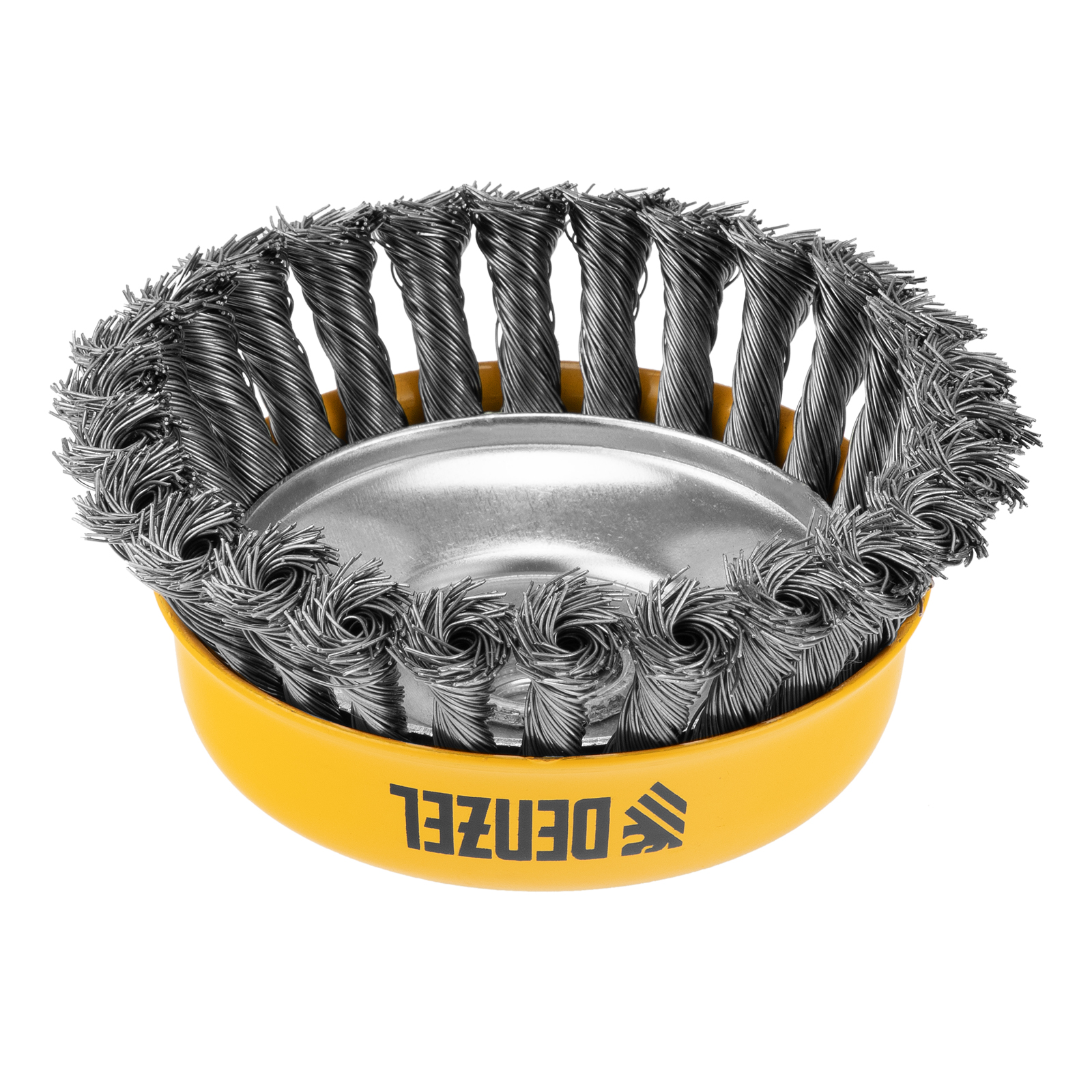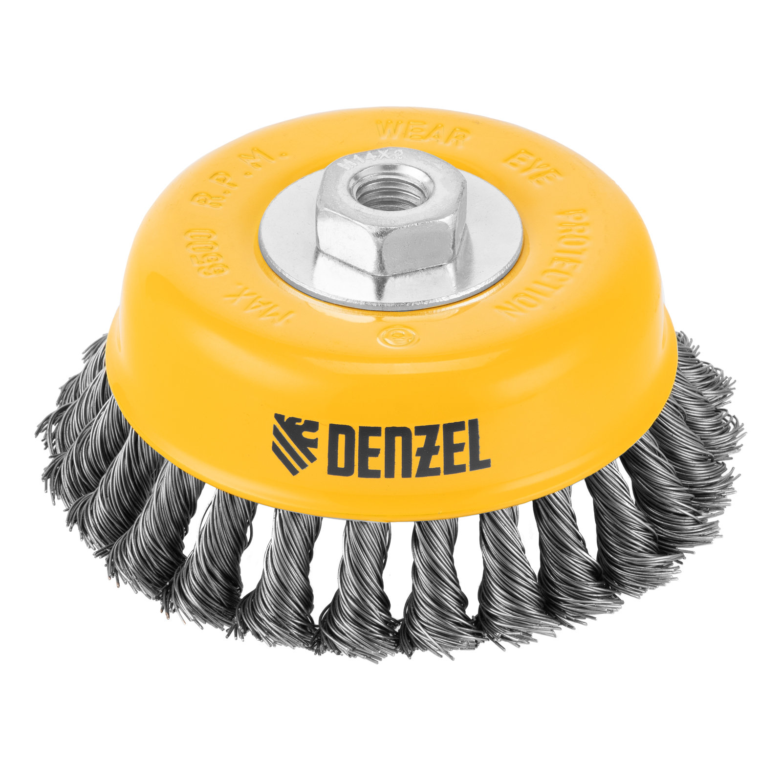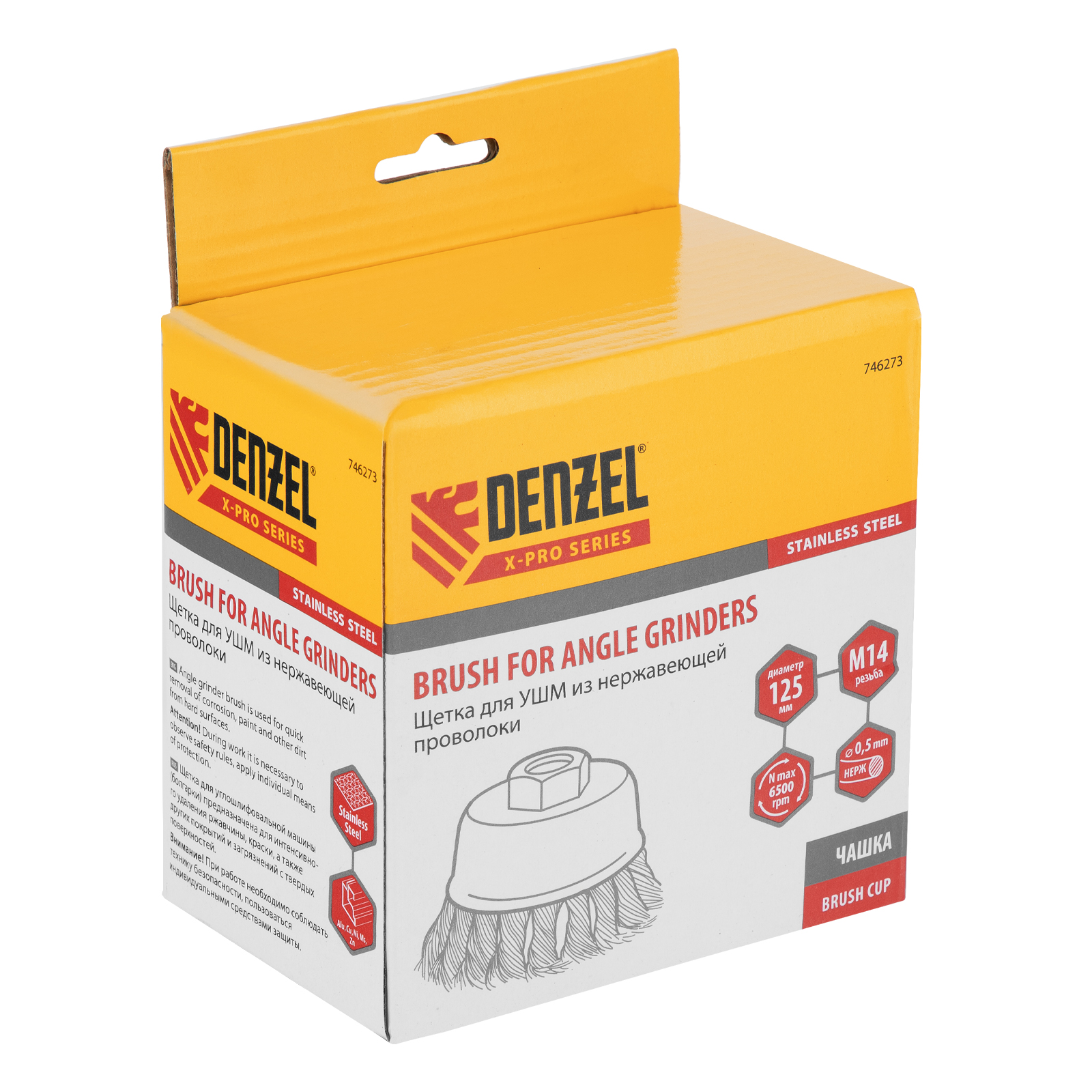 Щетка для УШМ «Чашка» Denzel 746273, М14, диаметром 125 мм, с щетиной из крученой нержавеющей проволоки диаметром 0,5 мм, предназначена для грубой очистки твердых поверхностей от ржавчины, лакокрасочных покрытий, загрязнений, удаления заусенцев, а также для зачистки сварных швов. Снимает толстый слой материала, идеально подходит для обработки изделий из нержавеющей стали. Щетка имеет форму чашки и позволяет очищать участки большой площади. Оснастку устанавливают на вал углошлифовальной машины. Рекомендуемая максимальная скорость вращения составляет 6500 об/мин. Во время работы следует использовать средства индивидуальной защиты — очки, респиратор, наушники, перчатки, а также специальную одежду и обувь. Щетка применяется в строительстве, на производстве, а также в быту.