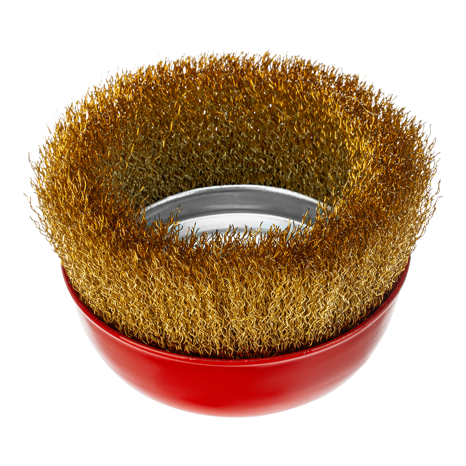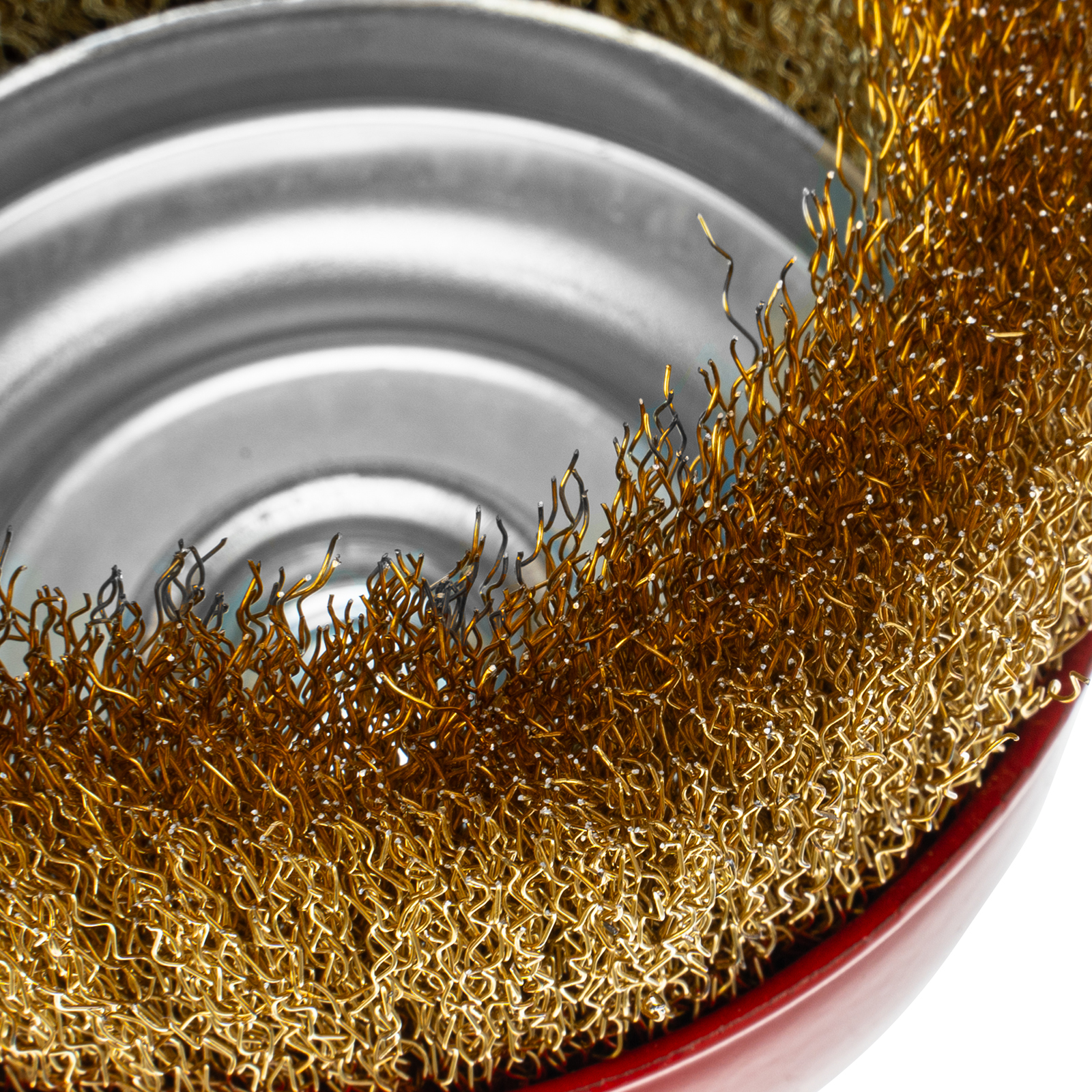 Щетка «чашка» Matrix 74606 диаметром 125 мм, с щетиной из латунированной витой проволоки, устанавливается на вал УШМ с помощью гайки М14. Предназначена для снятия тонкого слоя краски или лака, удаления ржавчины и загрязнений. При рекомендованной скорости вращения 6500 об/мин щеткой можно быстро обрабатывать участки большой площади.