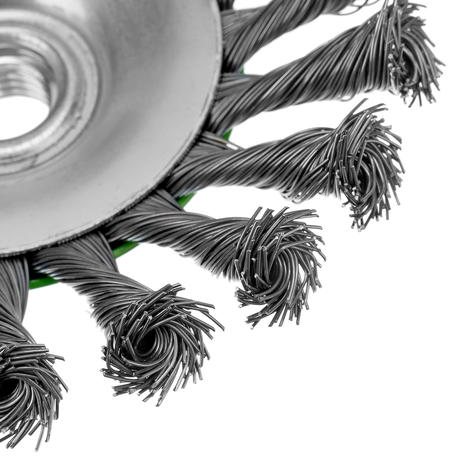 Щетка Сибртех «тарелка» 746117 диаметром 125 мм, с щетиной из крученой проволоки толщиной 0,5 мм, устанавливается на УШМ при помощи гайки М14. Выполнена в форме тарелки, за счет чего подходит для грубой (черновой) обработки плоских и угловых поверхностей. Удаляет ржавчину, загрязнения, лакокрасочные покрытия, подходит для зачистки сварных швов. Использование на скорости до 12500 об/мин позволяет продлить срок службы насадки.