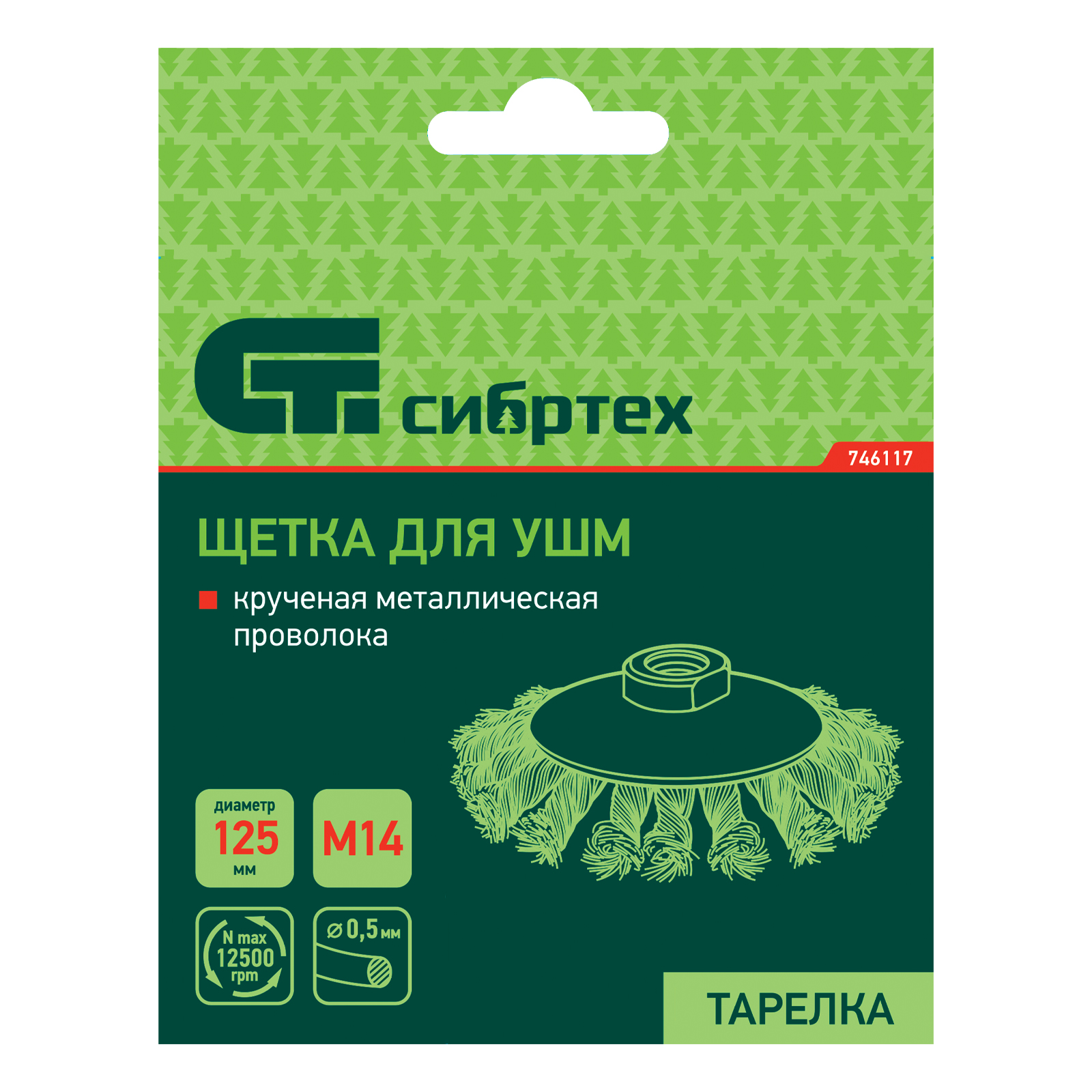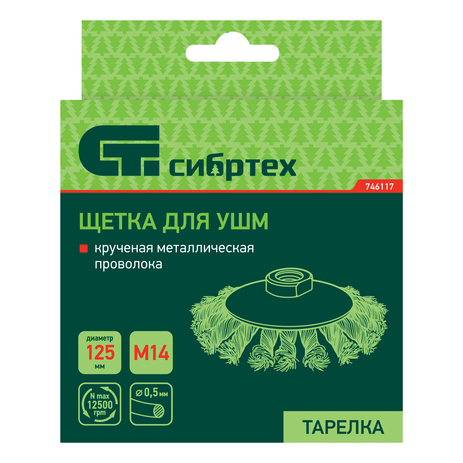<p>Щетка Сибртех «тарелка» 746117 диаметром 125 мм, с щетиной из крученой проволоки толщиной 0,5 мм, устанавливается на УШМ при помощи гайки М14. Выполнена в форме тарелки, за счет чего подходит для грубой (черновой) обработки плоских и угловых поверхностей. Удаляет ржавчину, загрязнения, лакокрасочные покрытия, подходит для зачистки сварных швов. Использование на скорости до 12500 об/мин позволяет продлить срок службы насадки.</p><h2>Преимущества</h2><ul><li>Износостойкость — щетина изготовлена из высококачественной стальной проволоки.</li><li>Универсальность — насадкой можно обрабатывать различные твердые материалы: металл, древесину, пластик, бетон.</li><li>Антикоррозийная защита — на корпус нанесено эмалевое покрытие, щетина покрыта техническим маслом.</li></ul>