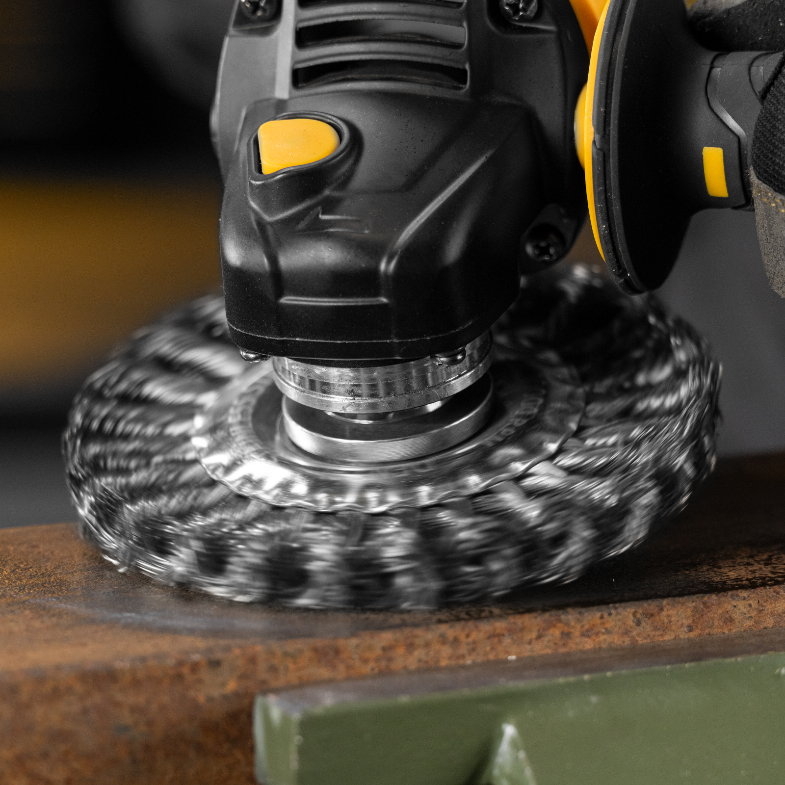 Плоская щетка для УШМ Denzel 746323 диаметром 125 мм, с посадкой 22,2 мм, с щетиной из крученой нержавеющей проволоки 0,5 мм, предназначена для снятия толстого верхнего слоя с металлических, деревянных, бетонных поверхностей. Удаляет загрязнения, ржавчину, старые лакокрасочные покрытия, заусенцы, окалину с ровных поверхностей и в труднодоступных местах. Оптимальна для обработки изделий из нержавеющей стали, а также зачистки сварных швов. Щетку устанавливают на фланец углошлифовальной машины, что удобно для выполнения большого объема работ, не требующих частой смены насадок. Рекомендуемая максимальная скорость вращения 10000 об/мин. Во время работы обязательно использование средств индивидуальной защиты. Щетка будет полезна на строительной площадке, производственном предприятии, а также пригодится в быту.