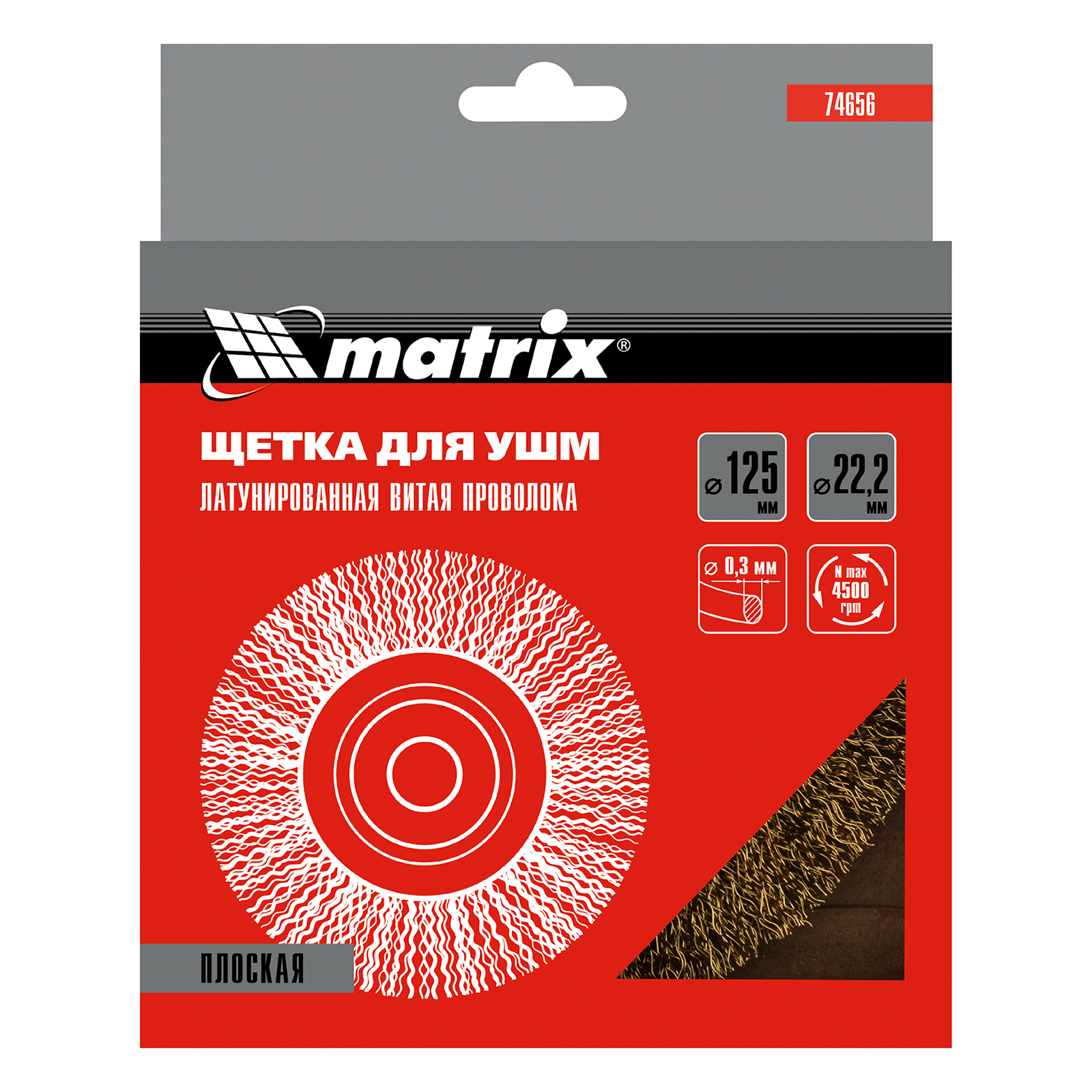 Плоская щетка для УШМ Matrix 74656 диаметром 125 мм, с щетиной из латунированной витой проволоки, посадкой 22,2 мм, предназначена для щадящей обработки поверхностей. Устанавливается на вал УШМ, поддерживающей скорость вращения не более 4500 об/мин. За счет плоской формы эффективно удаляет загрязнения, ржавчину и лакокрасочные покрытия в труднодоступных местах: углах и изгибах.