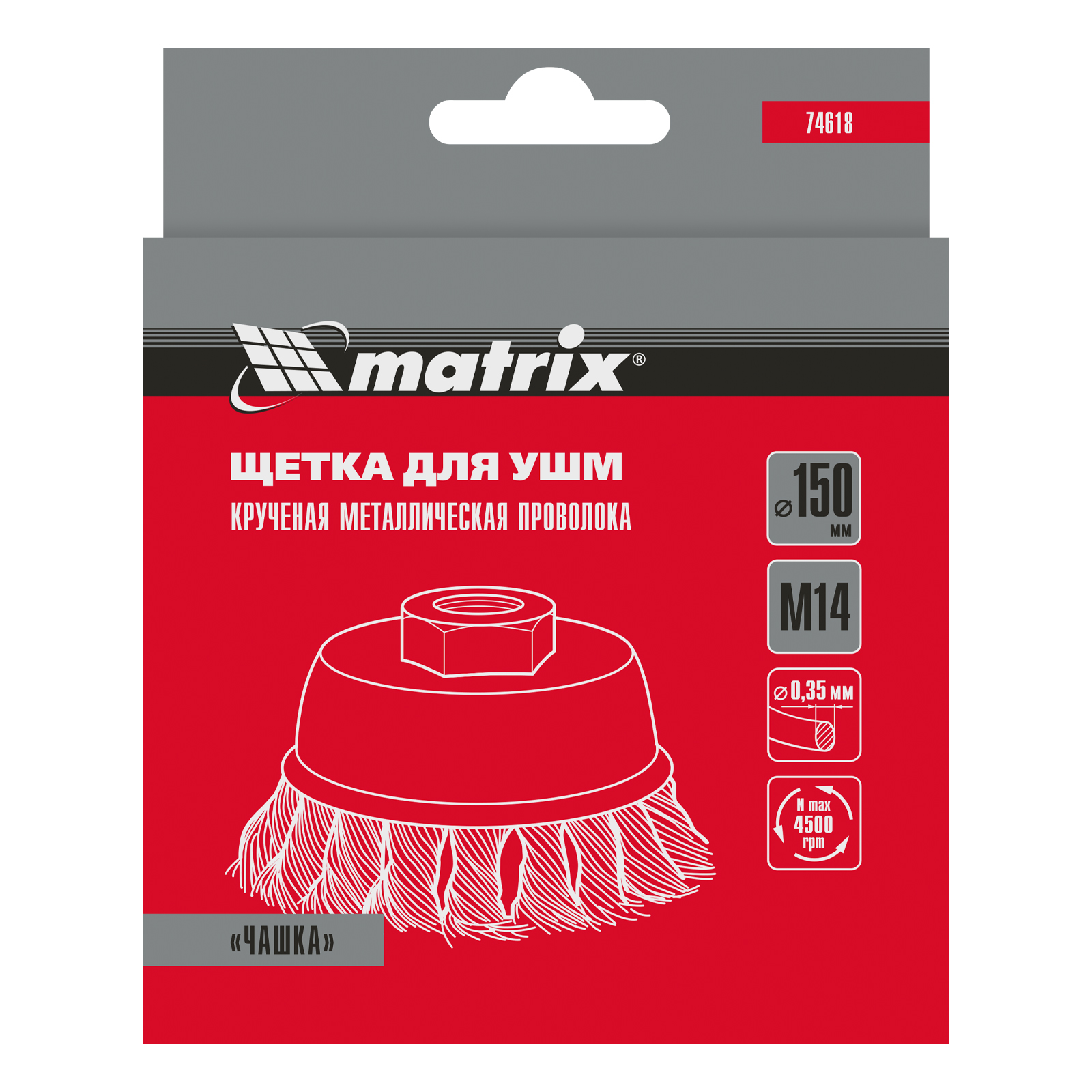 <p>Щетка Matrix «Чашка» 74618 диаметром 150 мм, с присоединительной резьбой М14, с щетиной из крученой проволоки диаметром 0,35 мм, устанавливается на УШМ, поддерживающую работу со скоростью 4500 об/мин. Щетина предназначена для грубой (черновой) обработки поверхностей, менее агрессивной по сравнению с щетиной 0,5 мм. Изделие подходит для удаления загрязнений, снятия толстого слоя ржавчины, ЛКМ, зачистки сварных швов.</p><h2>Преимущества</h2><ul><li>Прочность и долговечность — щетина из крученой стальной проволоки выдерживает значительные нагрузки.</li><li>Высокая производительность — насадка формы «чашка» оптимальна для зачистки больших поверхностей.</li><li>Универсальность — щетка подходит для обработки любых твердых материалов: металла, древесины, цветных металлов, пластика и т. д.</li><li>Устойчивость к разрушению — корпус покрыт эмалью, а щетина —техническим маслом.</li></ul>