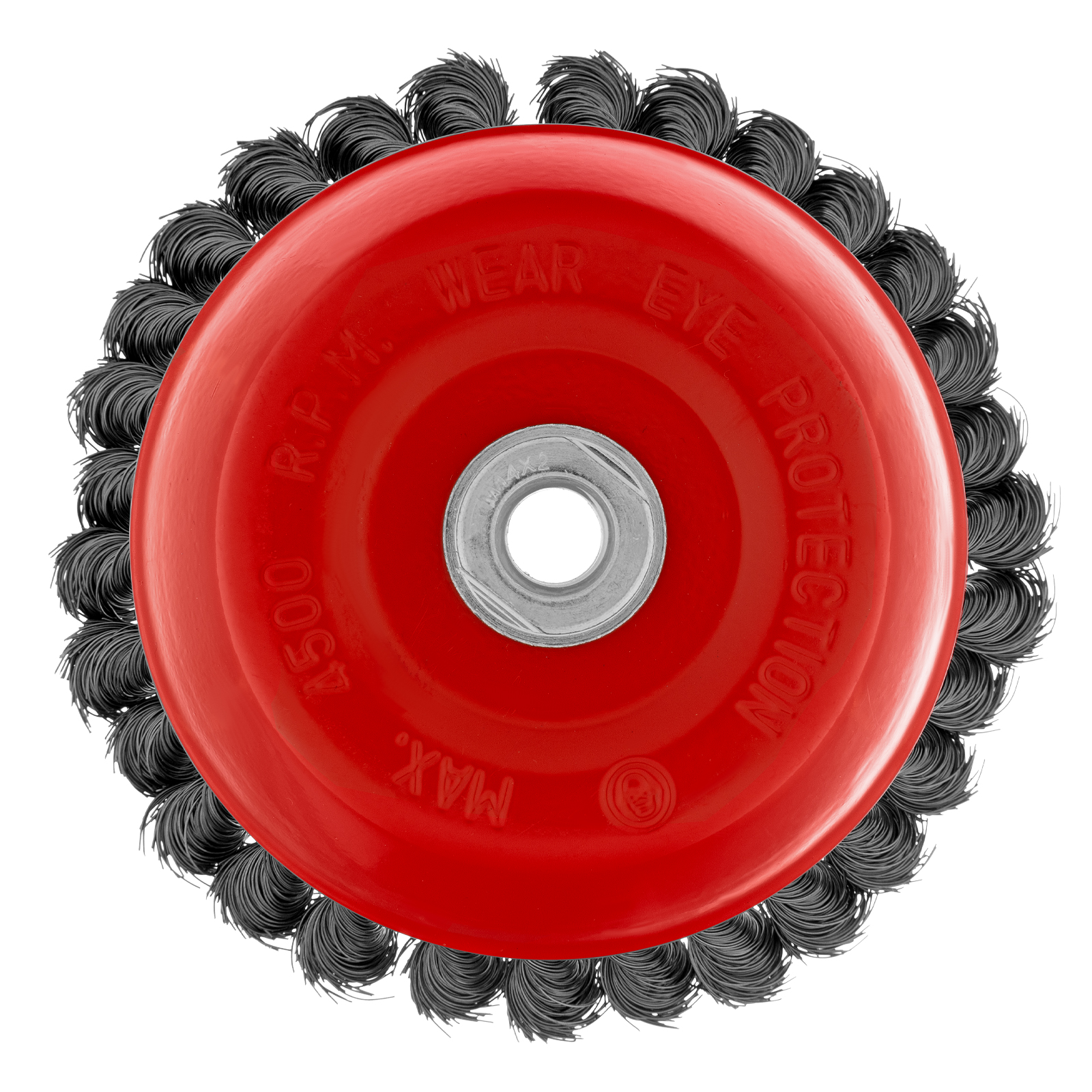 Щетка Matrix «Чашка» 74618 диаметром 150 мм, с присоединительной резьбой М14, с щетиной из крученой проволоки диаметром 0,35 мм, устанавливается на УШМ, поддерживающую работу со скоростью 4500 об/мин. Щетина предназначена для грубой (черновой) обработки поверхностей, менее агрессивной по сравнению с щетиной 0,5 мм. Изделие подходит для удаления загрязнений, снятия толстого слоя ржавчины, ЛКМ, зачистки сварных швов.