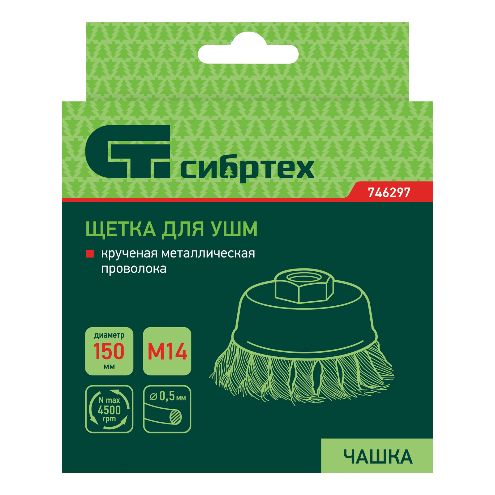 <p>Щетка Сибртех «Чашка» 746297 диаметром 150 мм, с присоединительной резьбой М14, с щетиной из крученой проволоки диаметром 0,5 мм, устанавливается на УШМ, поддерживающую работу со скоростью 4500 об/мин. Изделие предназначено для грубой (черновой) обработки поверхностей и подходит для удаления загрязнений, снятия толстого слоя ржавчины, ЛКМ, зачистки сварных швов.</p><h2>Преимущества</h2><ul><li>Прочность и долговечность — щетина из крученой стальной проволоки выдерживает значительные нагрузки.</li><li>Высокая производительность — насадка формы «чашка» оптимальна для зачистки больших поверхностей.</li><li>Универсальность — щетка подходит для обработки любых твердых материалов: металла, древесины, цветных металлов, пластика и т. д.</li><li>Устойчивость к разрушению — корпус покрыт эмалью, а щетина —техническим маслом.</li></ul>