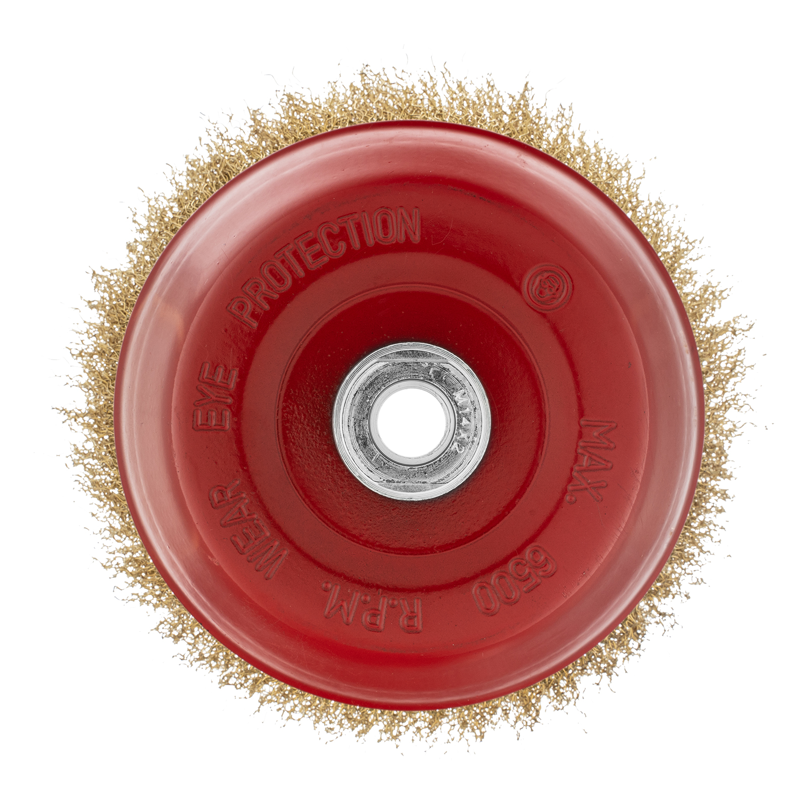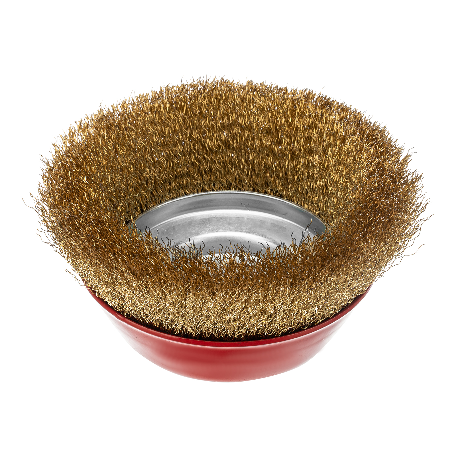 Щетка «чашка» Matrix 74607 диаметром 150 мм, с щетиной из латунированной витой проволоки, устанавливается на вал УШМ с помощью гайки М14. Предназначена для снятия тонкого слоя краски или лака, удаления ржавчины и загрязнений. При рекомендованной скорости вращения 4500 об/мин щеткой можно быстро обрабатывать участки большой площади.