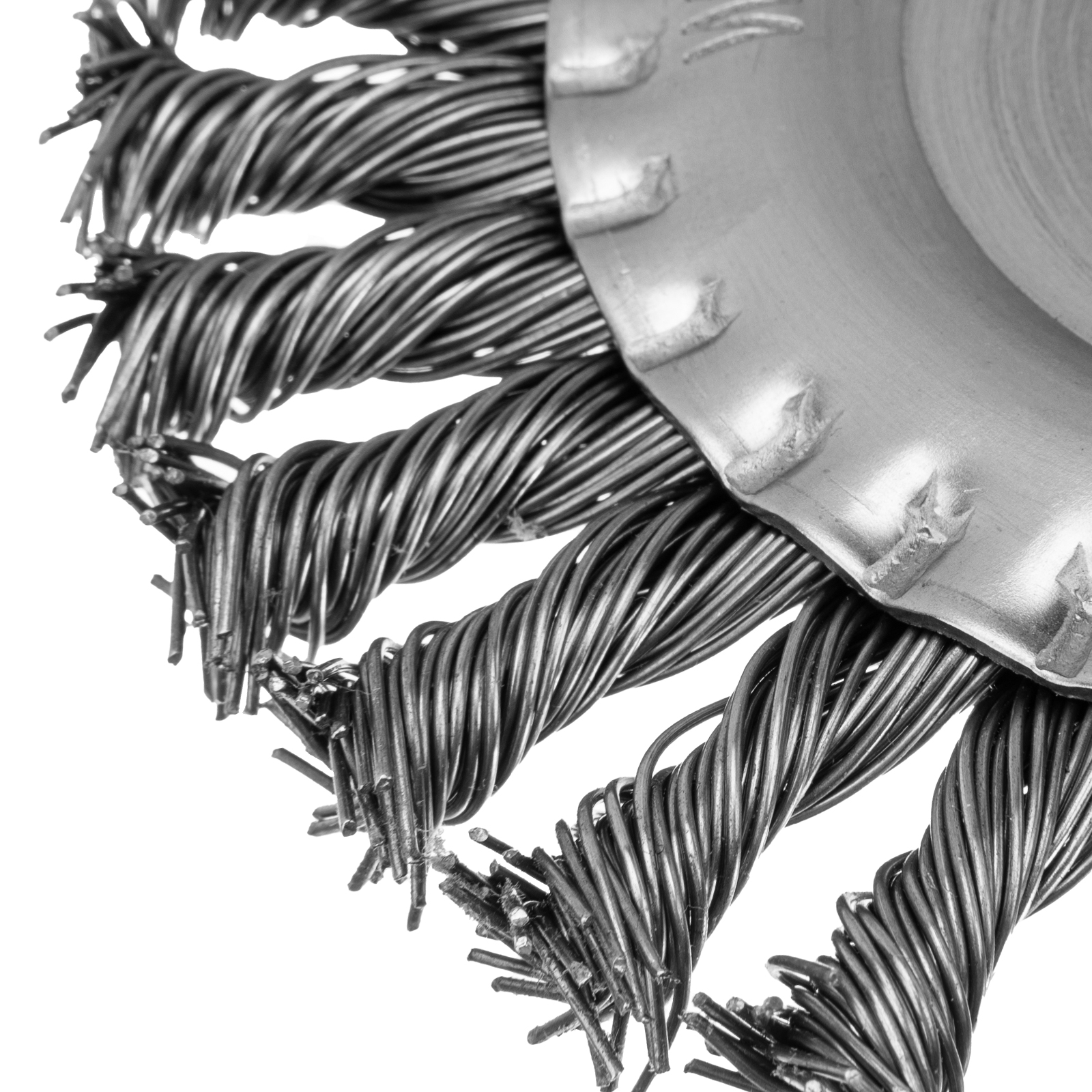 Плоская щетка Matrix 74645 диаметром 150 мм, с щетиной из крученой проволоки толщиной 0,8 мм и гайкой М14, — оснастка для УШМ, предназначенная для грубой (черновой) обработки поверхностей. Максимально допустимая скорость вращения шпинделя — 9000 об/мин. Щетка позволяет снять толстый слой ржавчины, лакокрасочных покрытий, загрязнений, а также зачистить сварные швы. Плоская форма удобна для обработки углов, изгибов и других труднодоступных мест.