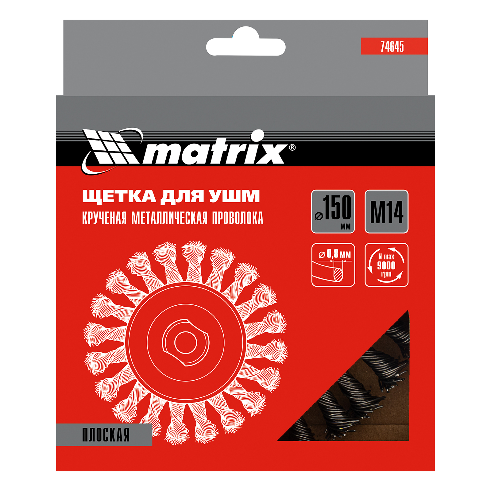 <p>Плоская щетка Matrix 74645 диаметром 150 мм, с щетиной из крученой проволоки толщиной 0,8 мм и гайкой М14, — оснастка для УШМ, предназначенная для грубой (черновой) обработки поверхностей. Максимально допустимая скорость вращения шпинделя — 9000 об/мин. Щетка позволяет снять толстый слой ржавчины, лакокрасочных покрытий, загрязнений, а также зачистить сварные швы. Плоская форма удобна для обработки углов, изгибов и других труднодоступных мест.</p><h2>Преимущества</h2><ul><li>Долговечность — щетина из высококачественной стальной проволоки устойчива к износу.</li><li>Универсальность — щетка подходит для обработки любых твердых поверхностей: из металла, древесины, цветных металлов, пластика и т. д.</li><li>Стойкость к разрушению — корпус оцинкован, а щетина покрыта техническим маслом для защиты от коррозии.</li></ul>