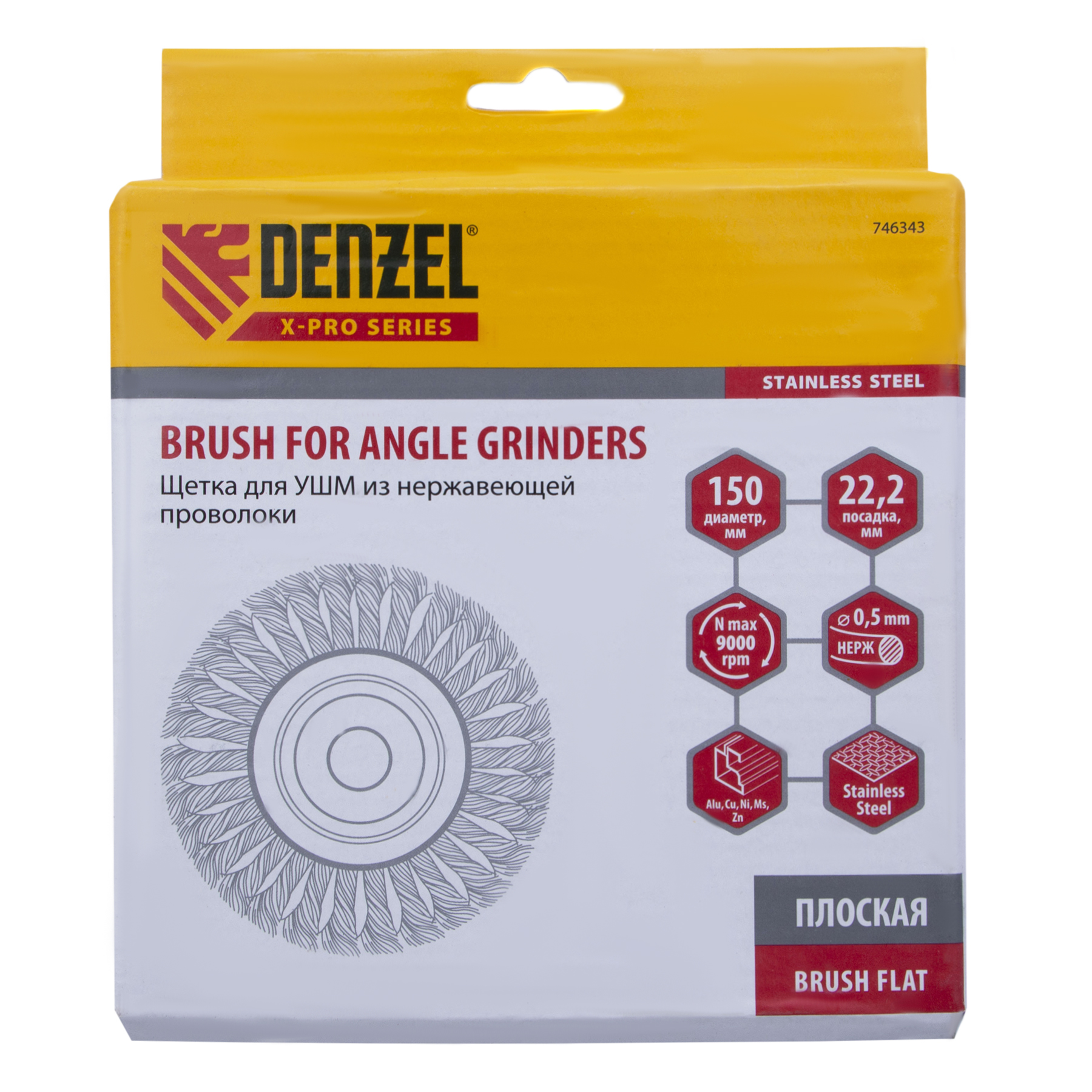 Плоская щетка для УШМ Denzel 746343 диаметром 150 мм, с посадкой 22,2 мм, с щетиной из крученой нержавеющей проволоки 0,5 мм, предназначена для снятия толстого верхнего слоя с металлических, деревянных, бетонных поверхностей. Удаляет загрязнения, ржавчину, старые лакокрасочные покрытия, заусенцы, окалину с ровных поверхностей и в труднодоступных местах. Оптимальна для обработки изделий из нержавеющей стали, а также зачистки сварных швов. Щетку устанавливают на фланец углошлифовальной машины, что удобно для выполнения большого объема работ, не требующих частой смены насадок. Рекомендуемая максимальная скорость вращения 9000 об/мин. Во время работы обязательно использование средств индивидуальной защиты. Щетка будет полезна на строительной площадке, производственном предприятии, а также пригодится в быту.