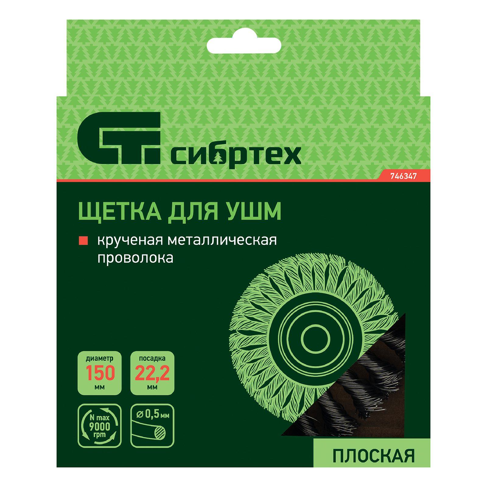 <p>Плоская щетка Сибртех 746347 диаметром 150 мм и посадкой 22,2 мм, с щетиной из крученой проволоки толщиной 0,5 мм, устанавливается на вал УШМ, поддерживающей скорость вращения не более 9000 об/мин. Эффективно удаляет загрязнения, толстый слой ржавчины и лакокрасочных материалов с поверхностей, поэтому используется для проведения грубой (черновой) обработки. Плоской щеткой удобно очищать труднодоступные места, в том числе углы и изгибы.</p><h2>Преимущества</h2><ul><li>Долговечность — щетина из высококачественной стальной проволоки устойчива к износу.</li><li>Универсальность — щетка подходит для обработки любых твердых поверхностей: из металла, древесины, цветных металлов, пластика и т. д.</li><li>Стойкость к разрушению — корпус оцинкован, а щетина покрыта техническим маслом для защиты от коррозии.</li></ul>
