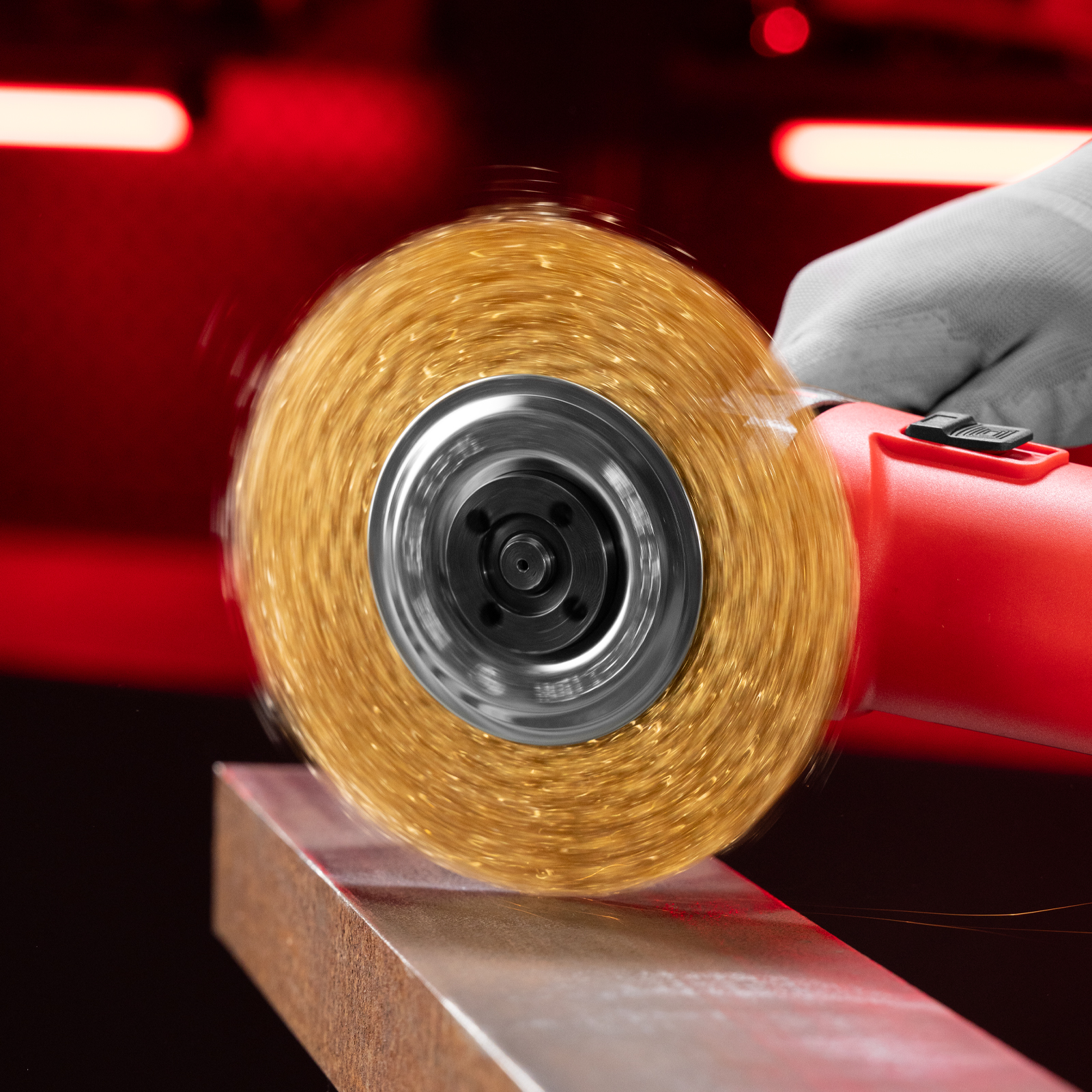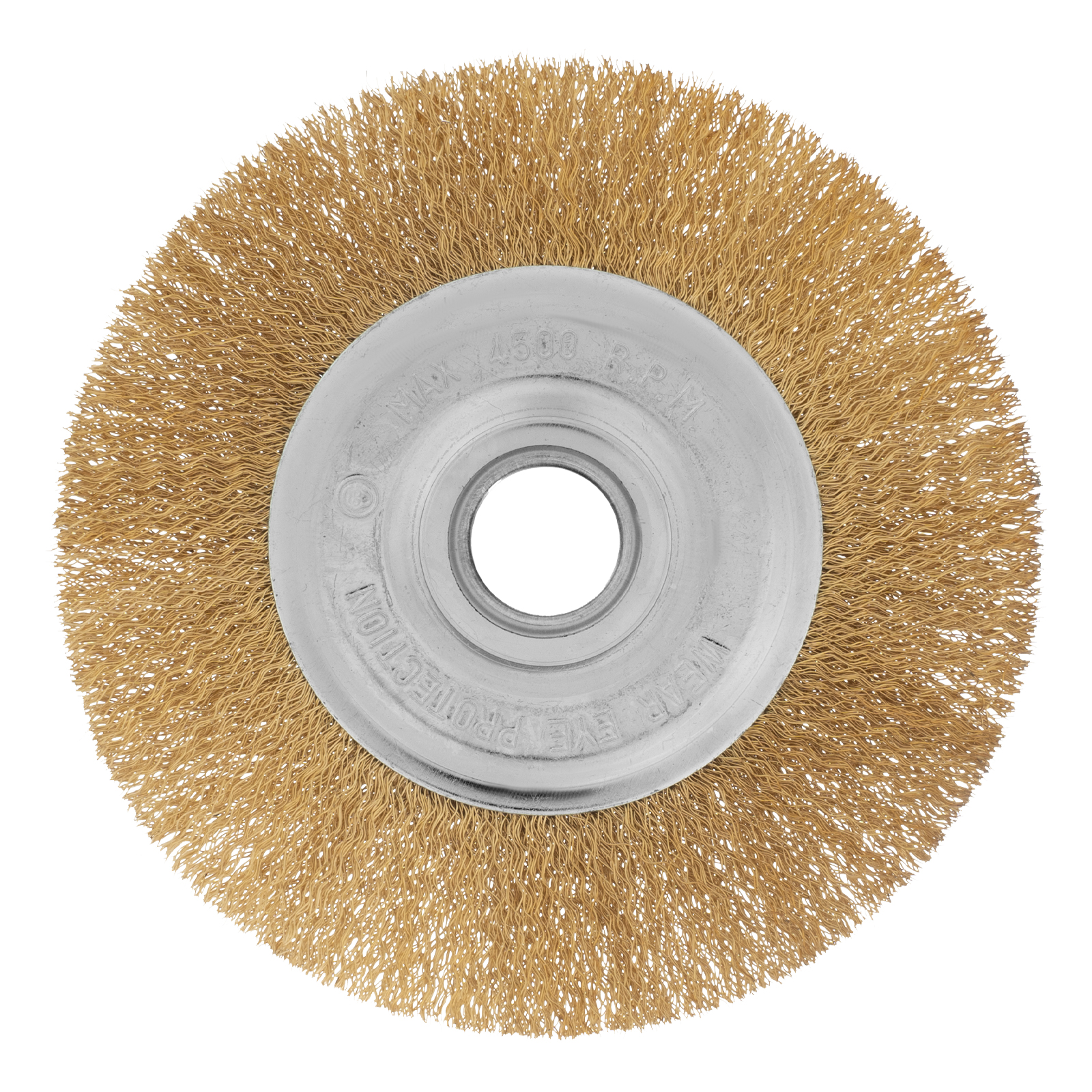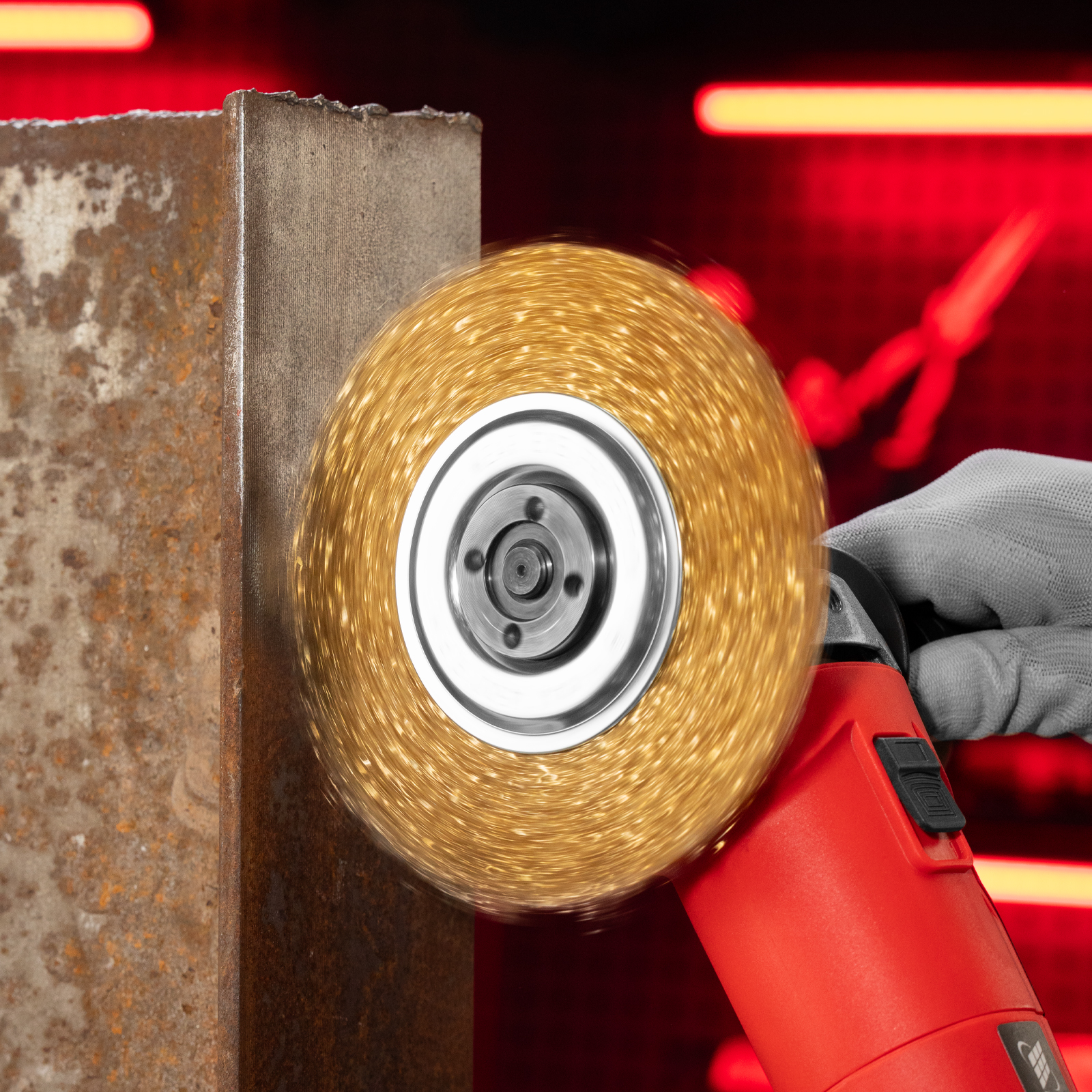 Плоская щетка для УШМ Matrix 74664 диаметром 150 мм, с щетиной из латунированной витой проволоки, посадкой 22,2 мм, предназначена для щадящей обработки поверхностей. Устанавливается на вал УШМ, поддерживающей скорость вращения не более 4500 об/мин. За счет плоской формы эффективно удаляет загрязнения, ржавчину и лакокрасочные покрытия в труднодоступных местах: углах и изгибах.