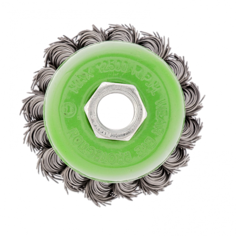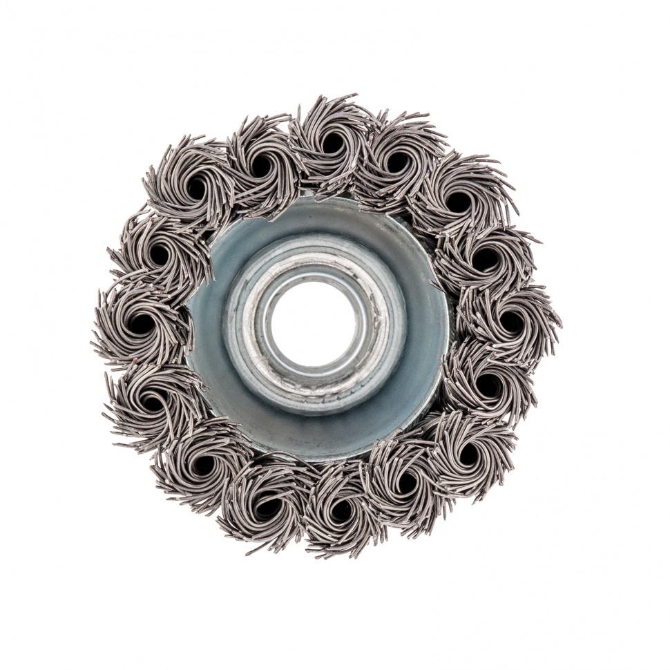 Щетка Сибртех «Чашка» 746207 диаметром 65 мм, с присоединительной резьбой М14, с щетиной из крученой проволоки диаметром 0,5 мм, устанавливается на УШМ, поддерживающую работу со скоростью 12500 об/мин. Изделие предназначено для грубой (черновой) обработки поверхностей и подходит для удаления загрязнений, снятия толстого слоя ржавчины, ЛКМ, зачистки сварных швов.