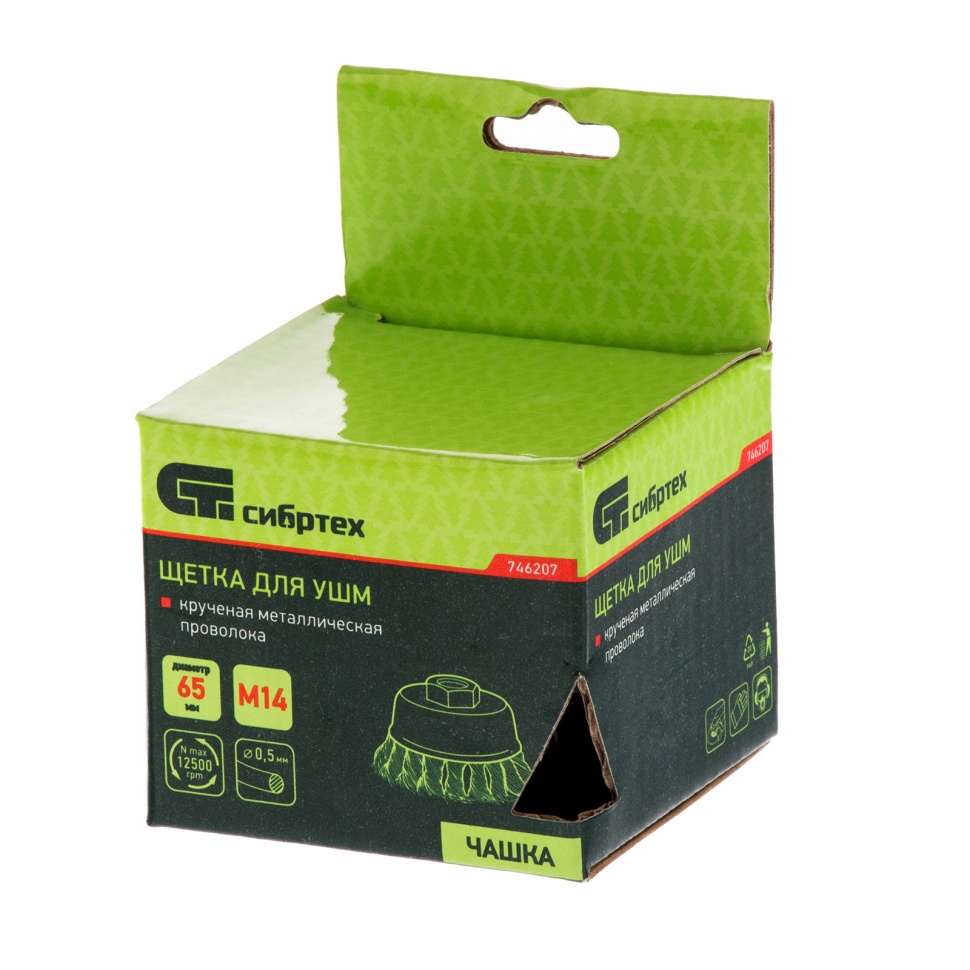 <p>Щетка Сибртех «Чашка» 746207 диаметром 65 мм, с присоединительной резьбой М14, с щетиной из крученой проволоки диаметром 0,5 мм, устанавливается на УШМ, поддерживающую работу со скоростью 12500 об/мин. Изделие предназначено для грубой (черновой) обработки поверхностей и подходит для удаления загрязнений, снятия толстого слоя ржавчины, ЛКМ, зачистки сварных швов.</p><h2>Преимущества</h2><ul><li>Прочность и долговечность — щетина из крученой стальной проволоки выдерживает значительные нагрузки.</li><li>Высокая производительность — насадка формы «чашка» оптимальна для зачистки больших поверхностей.</li><li>Универсальность — щетка подходит для обработки любых твердых материалов: металла, древесины, цветных металлов, пластика и т. д.</li><li>Устойчивость к разрушению — корпус покрыт эмалью, а щетина —техническим маслом.</li></ul>