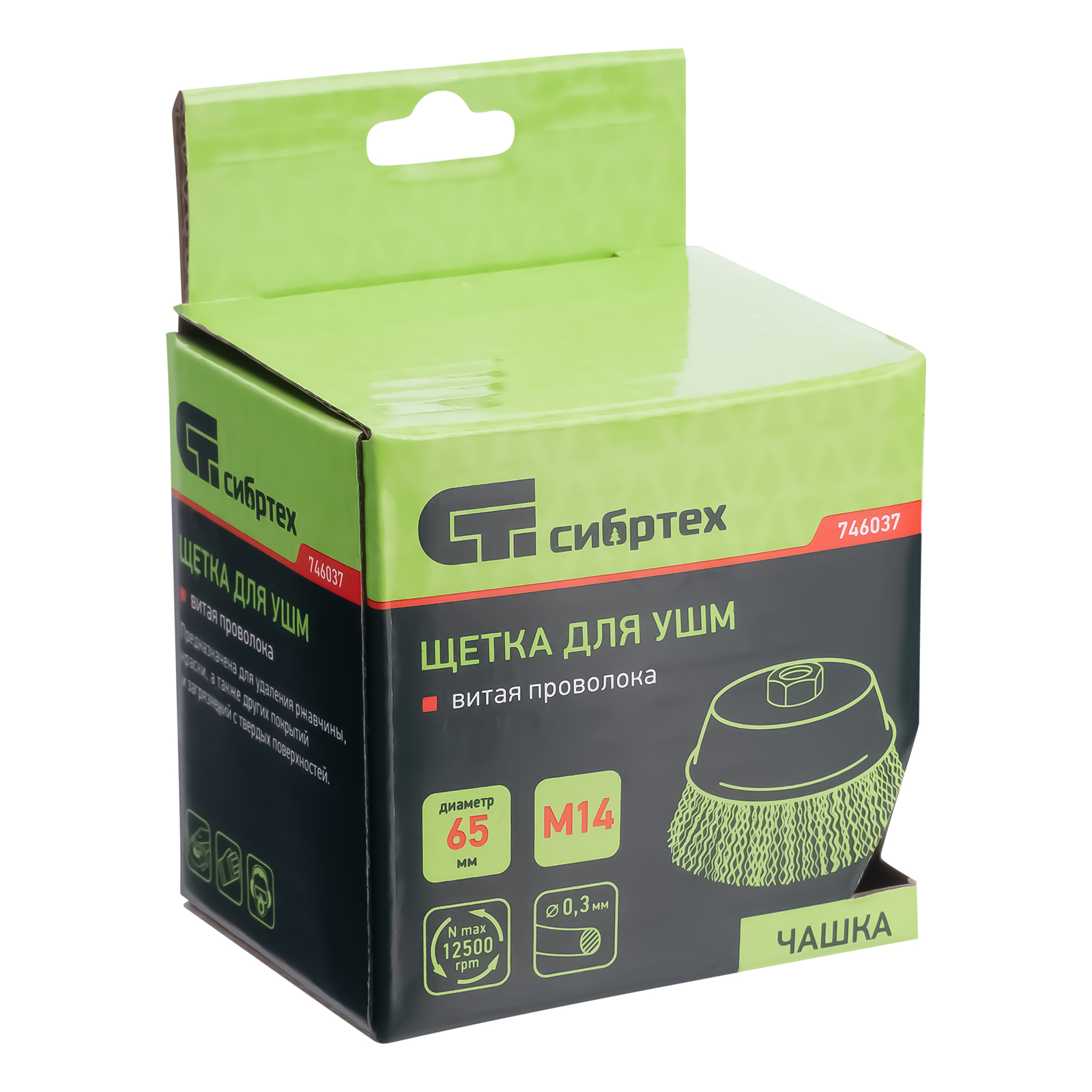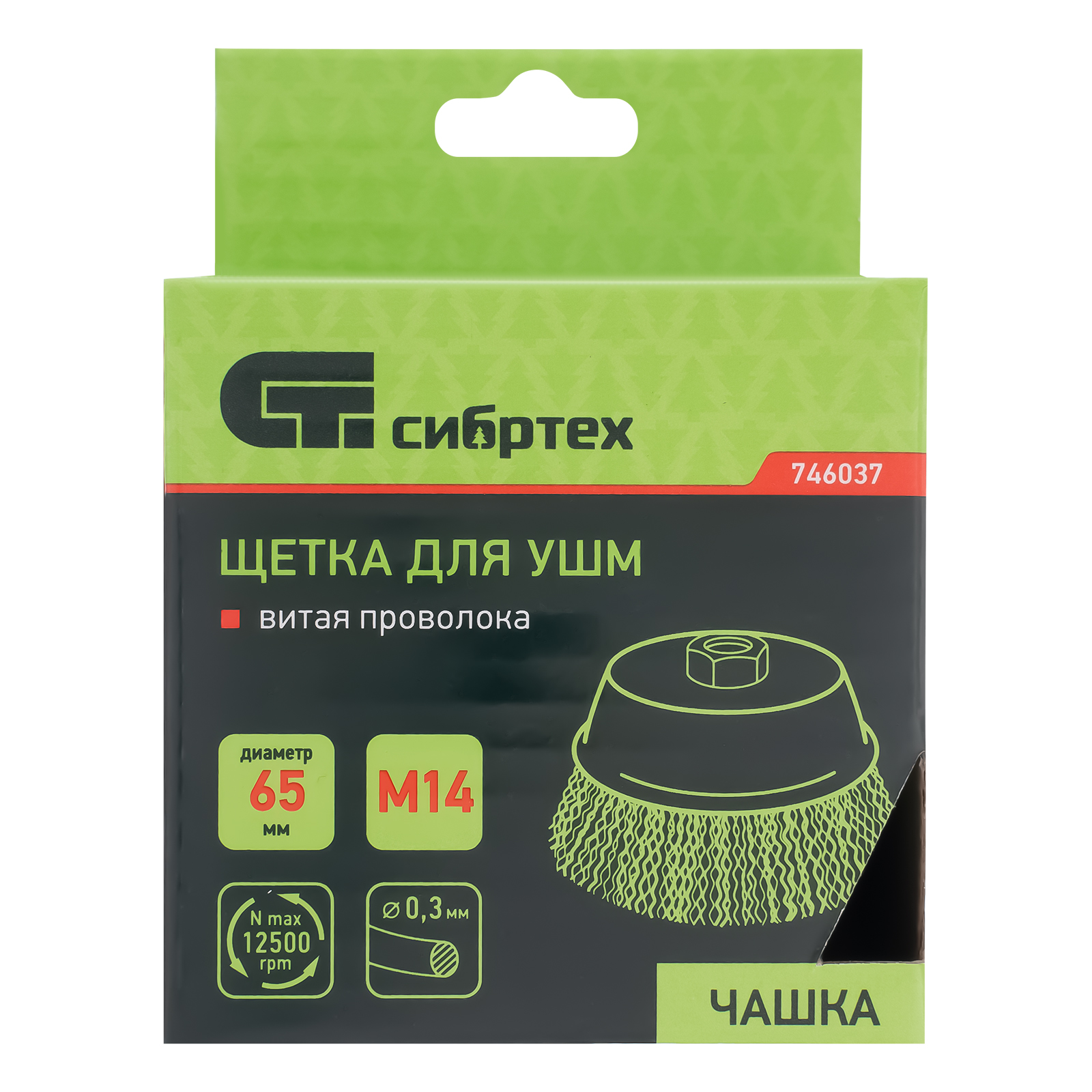 <p>Щетка для УШМ Сибртех «чашка» 746037, М14, диаметром 65 мм, с щетиной из витой проволоки 0,3 мм, предназначена для постепенного снятия тонкого слоя материала с металлических, деревянных и пластиковых поверхностей. Удаляет ржавчину, загрязнения, а также остатки краски и других покрытий. Подходит для обработки участков значительной площади. Щетку устанавливают на вал углошлифовальной машины (УШМ), рекомендуемая максимальная скорость вращения 12500 об/мин. Работать с оснасткой следует в спецодежде.</p><h2>Преимущества</h2><ul><li>Деформационная стойкость щетины — витая проволока принимает исходную форму после снятия нагрузок.</li><li>Защита от коррозии — корпус покрыт эмалью, а на щетину нанесено техническое масло.</li><li>Быстрая установка и замена насадки — щетка крепится на вал УШМ при помощи гайки М14.</li></ul>