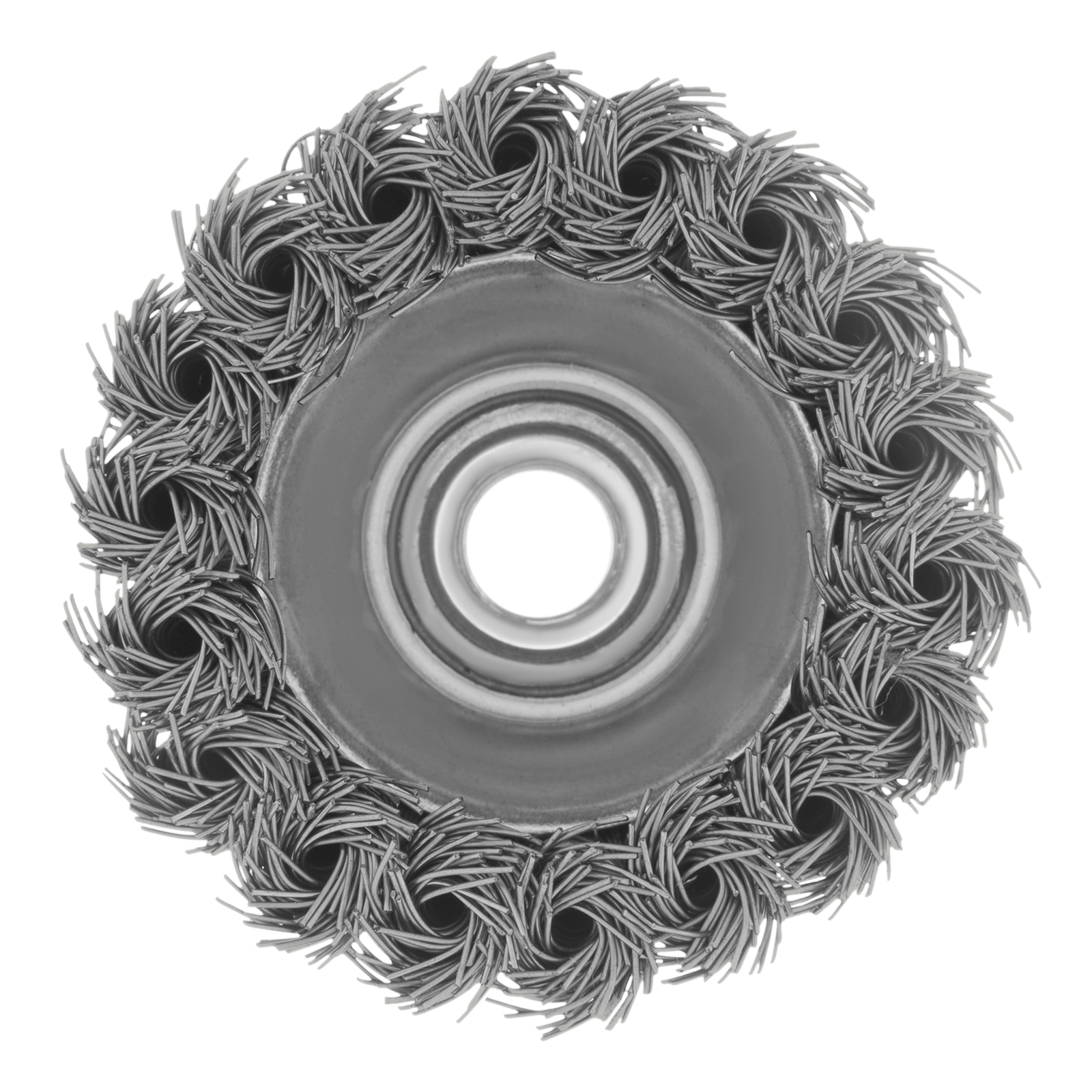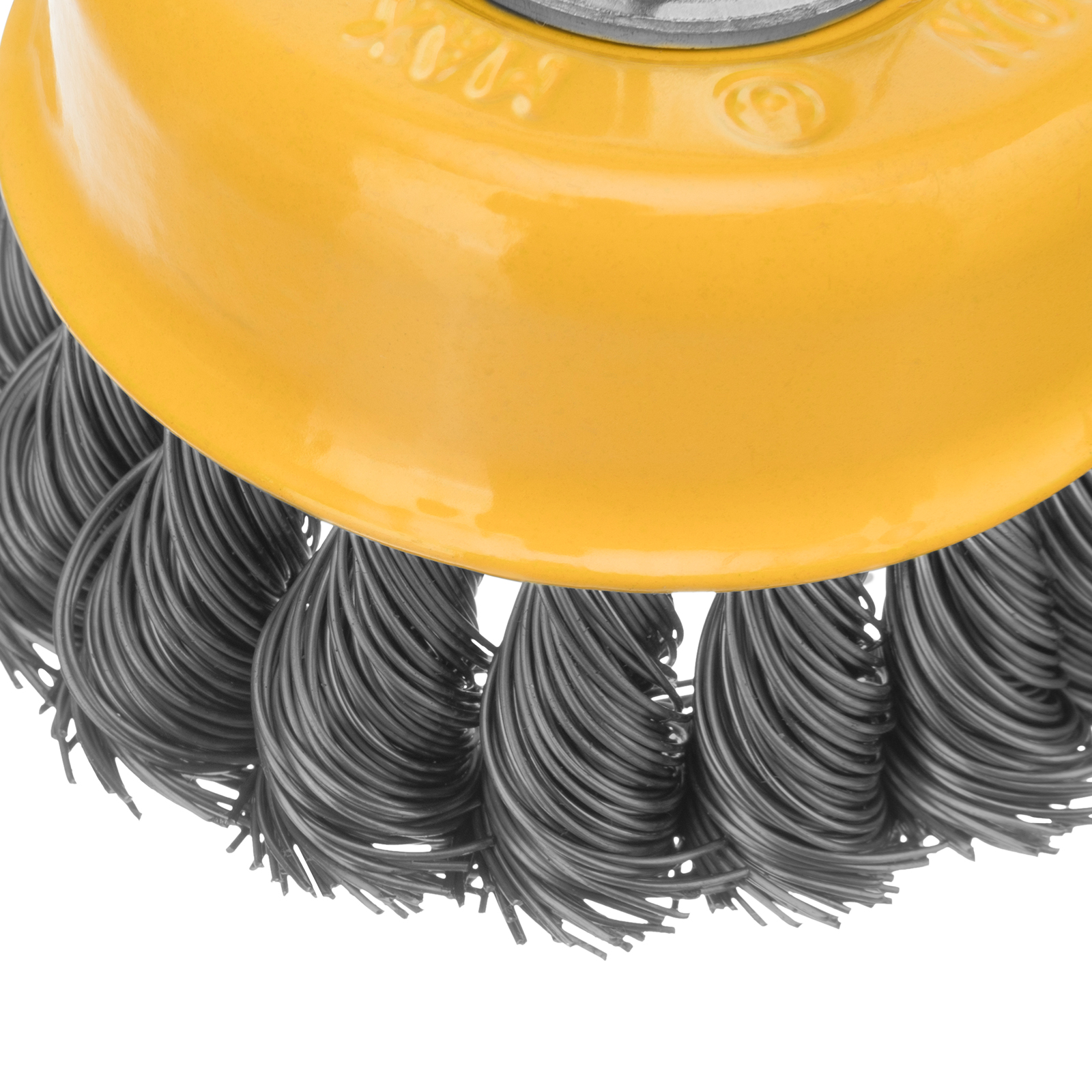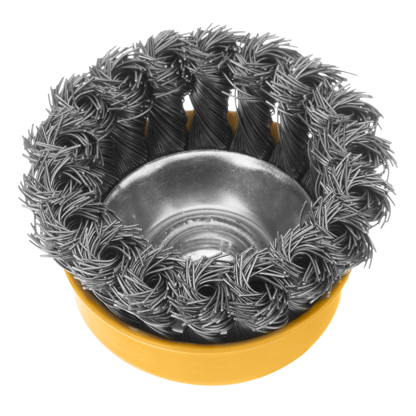Щетка для УШМ «Чашка» Denzel 746243, М14, диаметром 75 мм, с щетиной из крученой нержавеющей проволоки диаметром 0,5 мм, предназначена для грубой очистки твердых поверхностей от ржавчины, лакокрасочных покрытий, загрязнений, удаления заусенцев, а также для зачистки сварных швов. Снимает толстый слой материала, идеально подходит для обработки изделий из нержавеющей стали. Щетка имеет форму чашки и позволяет очищать участки большой площади. Оснастку устанавливают на вал углошлифовальной машины. Рекомендуемая максимальная скорость вращения составляет 12500 об/мин. Во время работы следует использовать средства индивидуальной защиты — очки, респиратор, наушники, перчатки, а также специальную одежду и обувь. Щетка применяется в строительстве, на производстве, а также в быту.