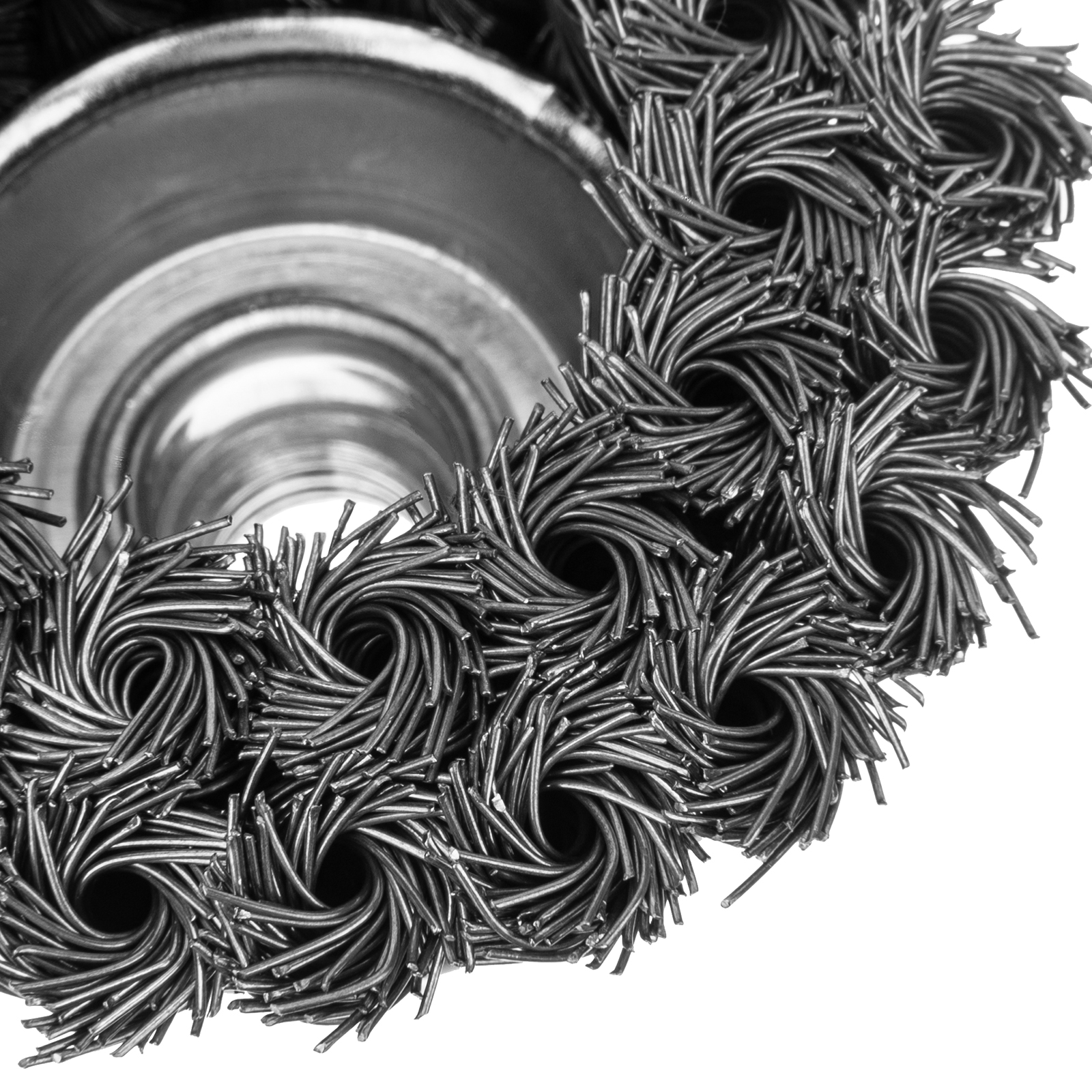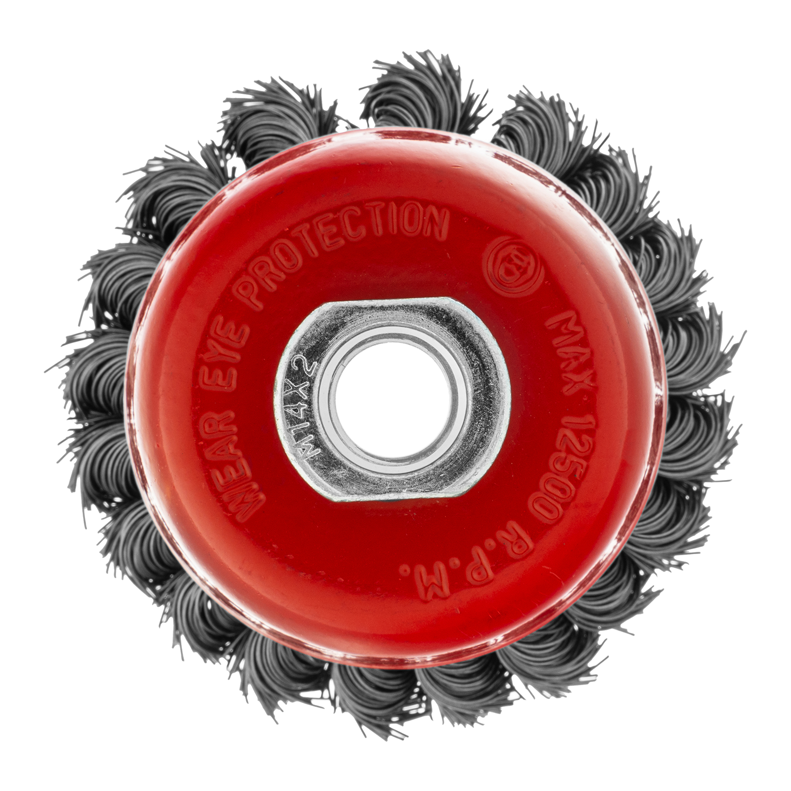 Двухрядная щетка Matrix «Чашка» 74681 диаметром 75 мм, с щетиной из крученой проволоки толщиной 0,5 мм, устанавливается на вал углошлифовальной машины с помощью гайки М14. Рекомендованная максимальная скорость вращения — до 12500 об/мин. Оснастка оптимальна для грубой (черновой) обработки: снятия старого слоя лакокрасочного покрытия и ржавчины, удаления загрязнений, зачистки сварных швов. Эффективно справляется с зачисткой больших поверхностей, подходит для выполнения работ повышенной сложности.