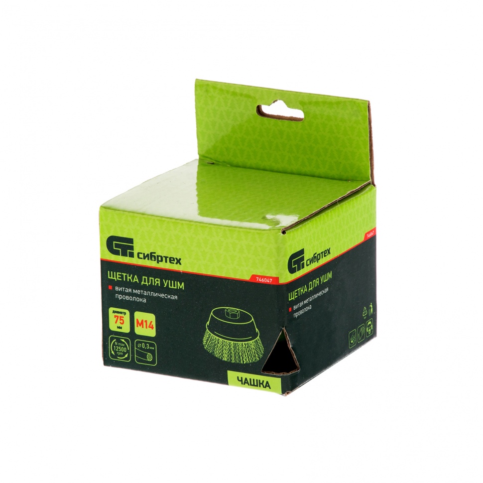 <p>Щетка для УШМ Сибртех «чашка» 746047, М14, диаметром 75 мм, с щетиной из витой проволоки 0,3 мм, предназначена для постепенного снятия тонкого слоя материала с металлических, деревянных и пластиковых поверхностей. Удаляет ржавчину, загрязнения, а также остатки краски и других покрытий. Подходит для обработки участков значительной площади. Щетку устанавливают на вал углошлифовальной машины (УШМ), рекомендуемая максимальная скорость вращения 12500 об/мин. Работать с оснасткой следует в спецодежде.</p><h2>Преимущества</h2><ul><li>Деформационная стойкость щетины — витая проволока принимает исходную форму после снятия нагрузок.</li><li>Защита от коррозии — корпус покрыт эмалью, а на щетину нанесено техническое масло.</li><li>Быстрая установка и замена насадки — щетка крепится на вал УШМ при помощи гайки М14.</li></ul>