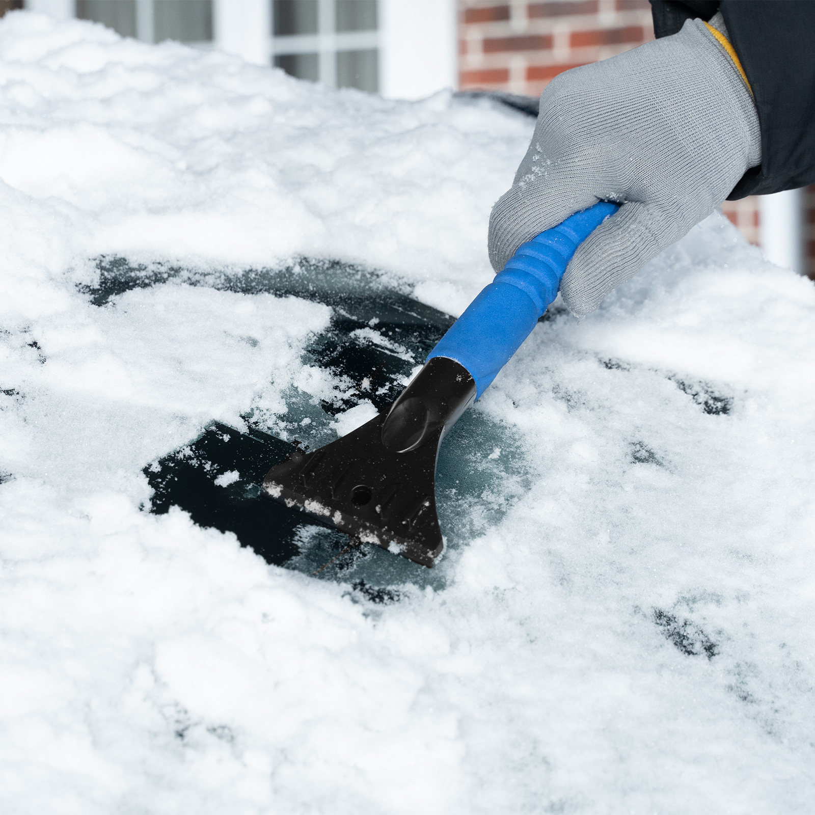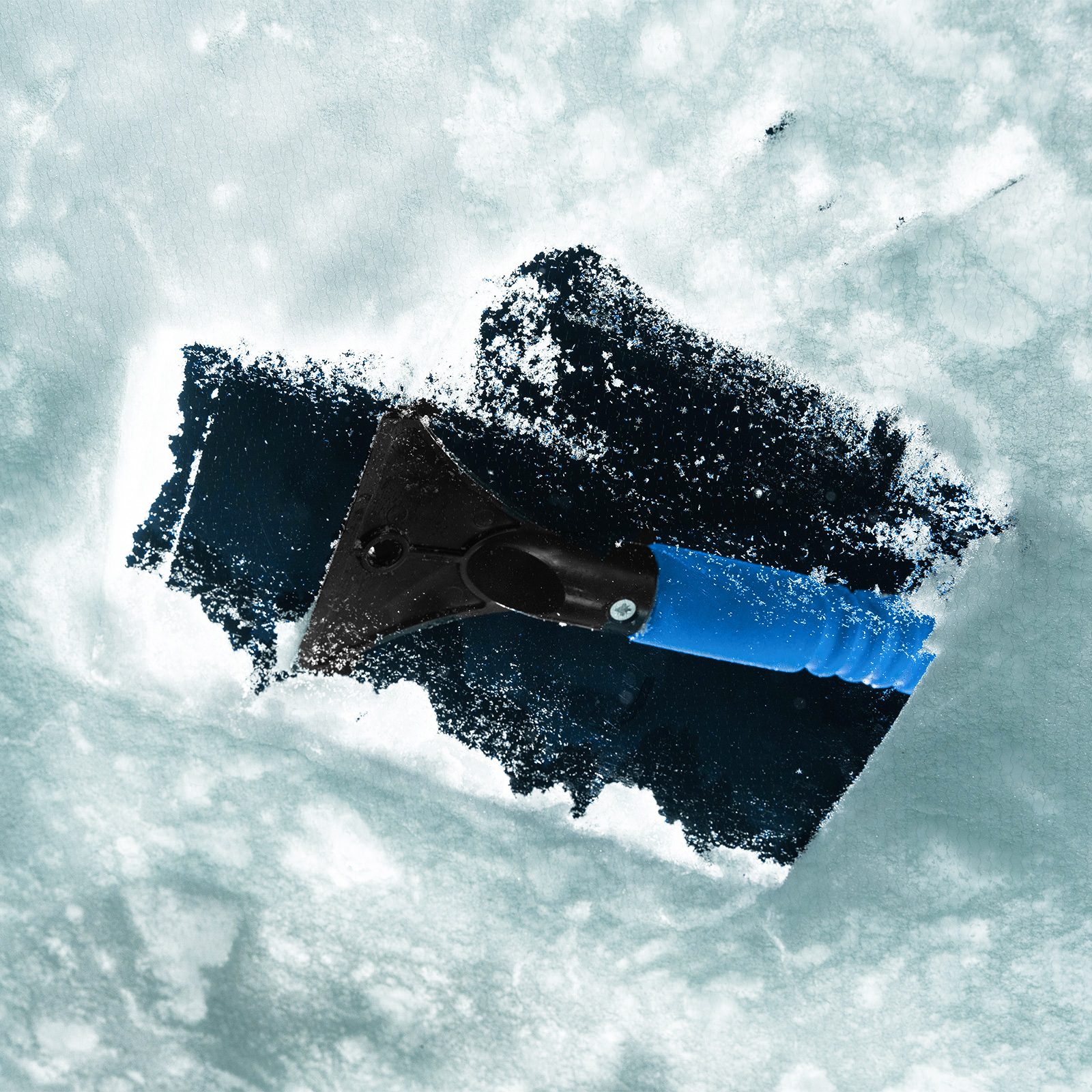 - Эффективность — усиленный скребок шириной 9 см успешно справляется с твердой наледью.