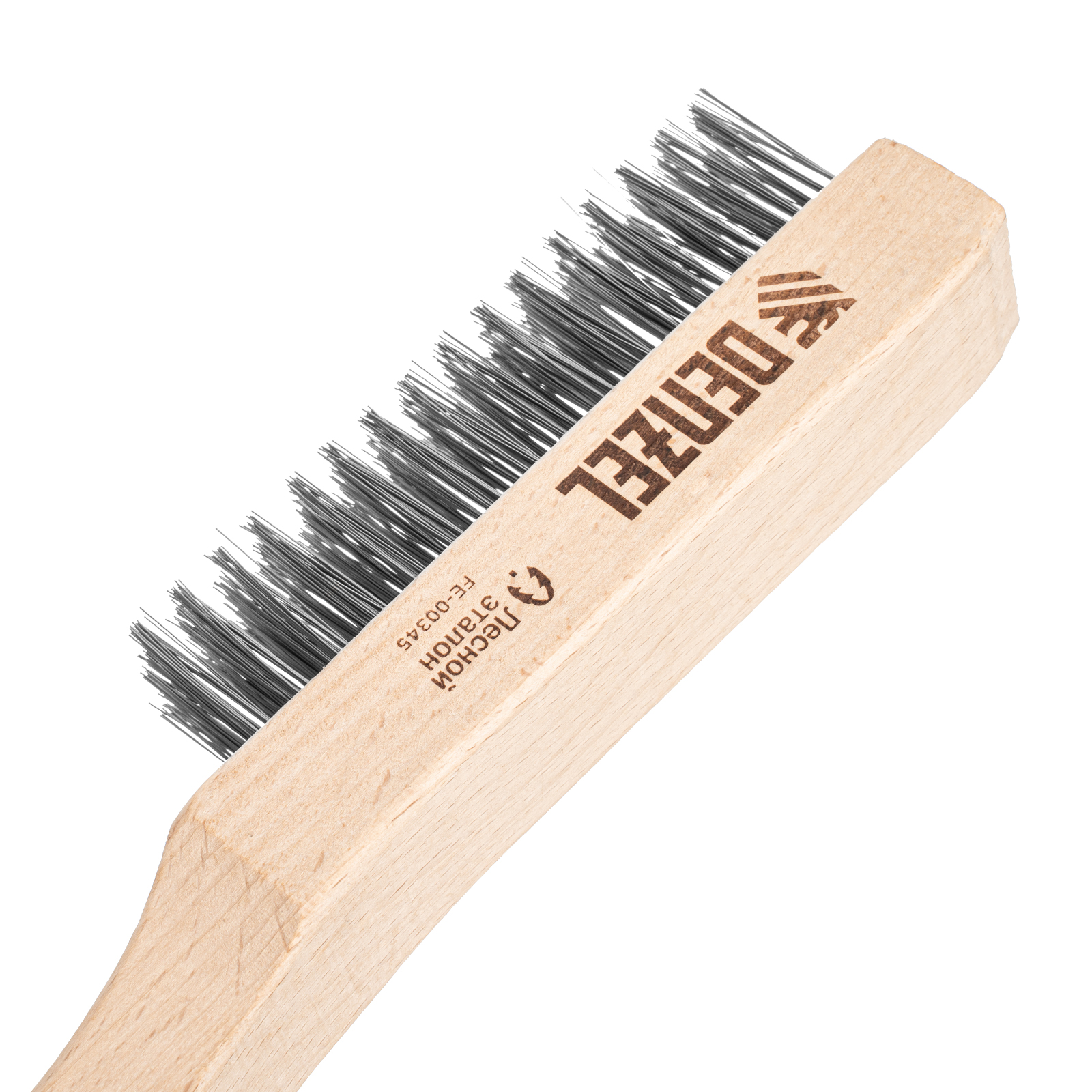 Зачистная 5-рядная щетка Denzel 74845 с прямой проволокой из нержавеющей стали и деревянной рукояткой — ручной инструмент для обработки деревянных, металлических и других поверхностей. Позволяет удалять загрязнения, ржавчину, остатки отделочных покрытий и т.д. Стальная щетина толщиной 0,3 мм с высокой абразивной способностью, расположенная в 5 рядов, обеспечивает эффективное выполнение работ.