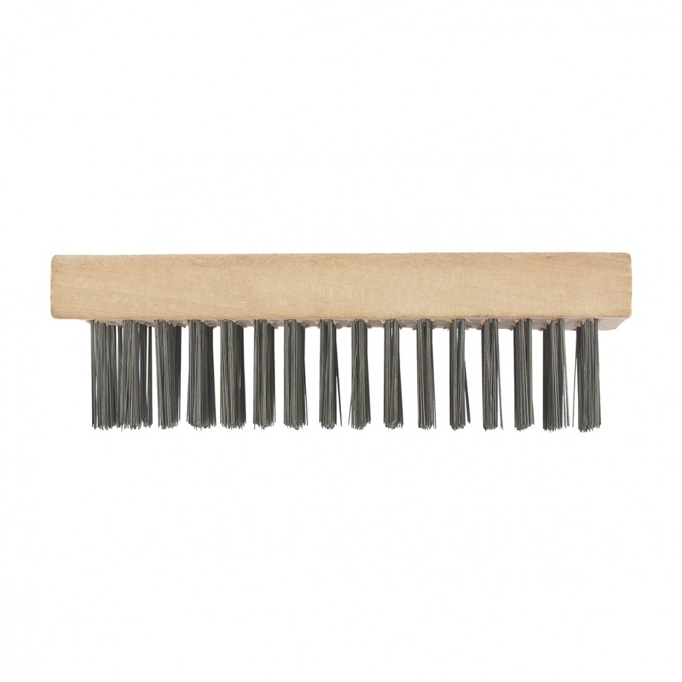 <p>Плоская зачистная 5-рядная щетка Сибртех 74810 с деревянным корпусом и щетиной из закаленной прямой проволоки — ручной инструмент, позволяющий очистить поверхность от заусенцев, загрязнений, ржавчины, остатков штукатурки и лакокрасочного слоя. Расположенный в 5 рядов ворс обеспечивает эффективное воздействие на обрабатываемую поверхность. Щетка подходит для обработки металла, древесины, пластика и сварных швов. Используется в строительстве, авторемонтном деле, будет полезна во время ремонта и в быту.</p><h2>Преимущества</h2><ul><li>Прочность и износостойкость — ворс изготовлен из закаленной стальной проволоки.</li><li>Надежность — щетка имеет прочный деревянный корпус, щетина крепко зафиксирована в основании.</li><li>Устойчивость к повышенным нагрузкам — в каждом пучке 20 щетинок.</li><li>Защита от образования коррозии — проволока покрыта масляной пленкой.</li></ul>