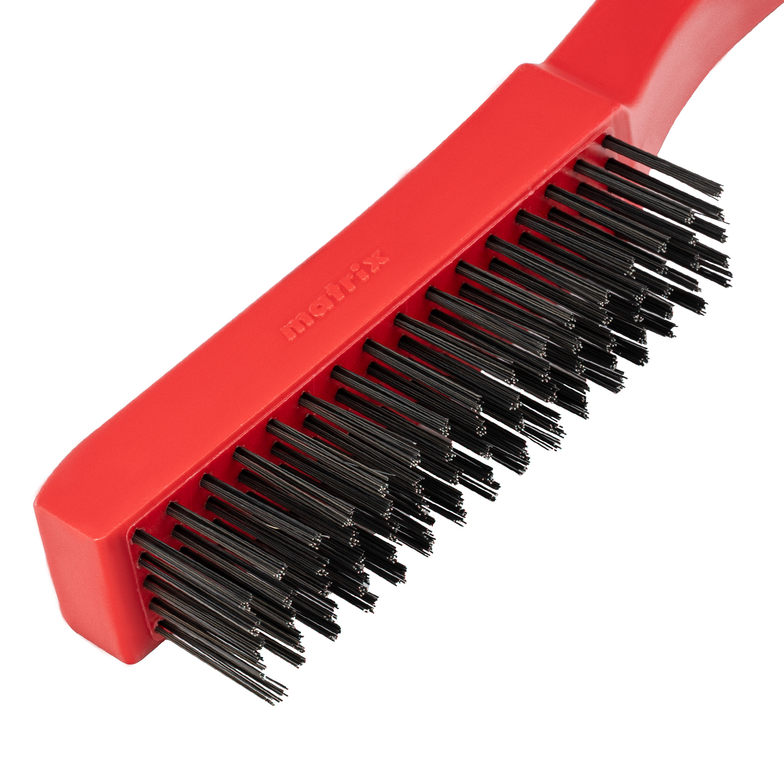 Зачистная пятирядная щетка Matrix 74815 с пластиковой ручкой и щетиной из закаленной прямой проволоки используется для удаления загрязнений, ржавчины, остатков лакокрасочных покрытий с металлических, деревянных, бетонных поверхностей. Пучки расположены в 5 рядов, в каждом пучке 20 щетинок, поэтому щетка выдерживает повышенные нагрузки. Щетка пригодится во время проведения строительных и ремонтных работ, а также будет полезна дома или в гараже.