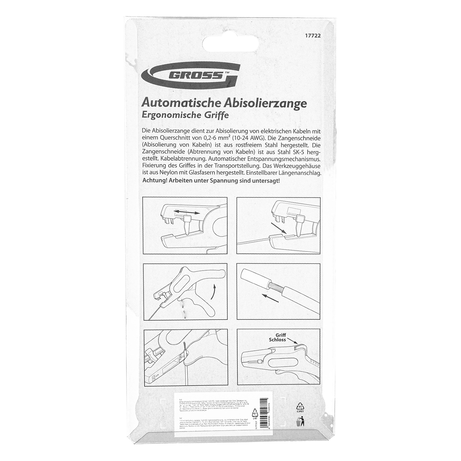 Щипцы для зачистки электропроводов Gross 17722 с лезвиями из нержавеющей стали предназначены для электромонтажных работ с проводами сечением 0,2-6 мм² (10-24 AWG). С их помощью можно обрезать и зачистить медные и алюминиевые провода. Инструмент пригодится для бытового и профессионального применения.
