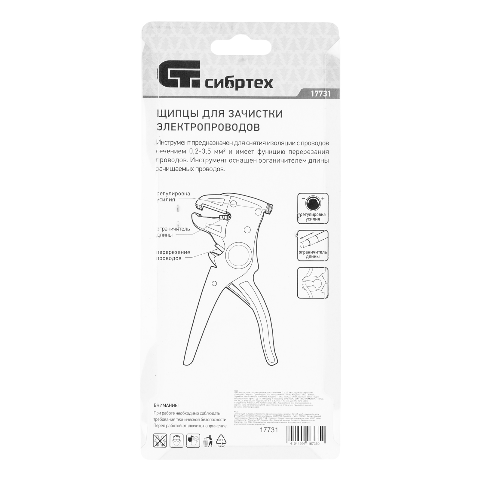 <p>Щипцы Сибртех 17731 рассчитаны на зачистку и снятие изоляции с электропроводов сечением 0,2-3,5 мм2, а также они оснащены кусачками для обрезания кабеля. Инструмент станет незаменимым помощником в квартире, гараже, на даче, производстве, строительной площадке во время выполнения электромонтажных работ.</p><h2>Преимущества</h2><ul><li>Встроенный ограничитель позволяет регулировать длину зачищаемых электропроводов.</li><li>Функция авторазжима рукояток повышает удобство работы.</li><li>Руки не устают во время работы, т.к. вес щипцов составляет 218 г.</li></ul>