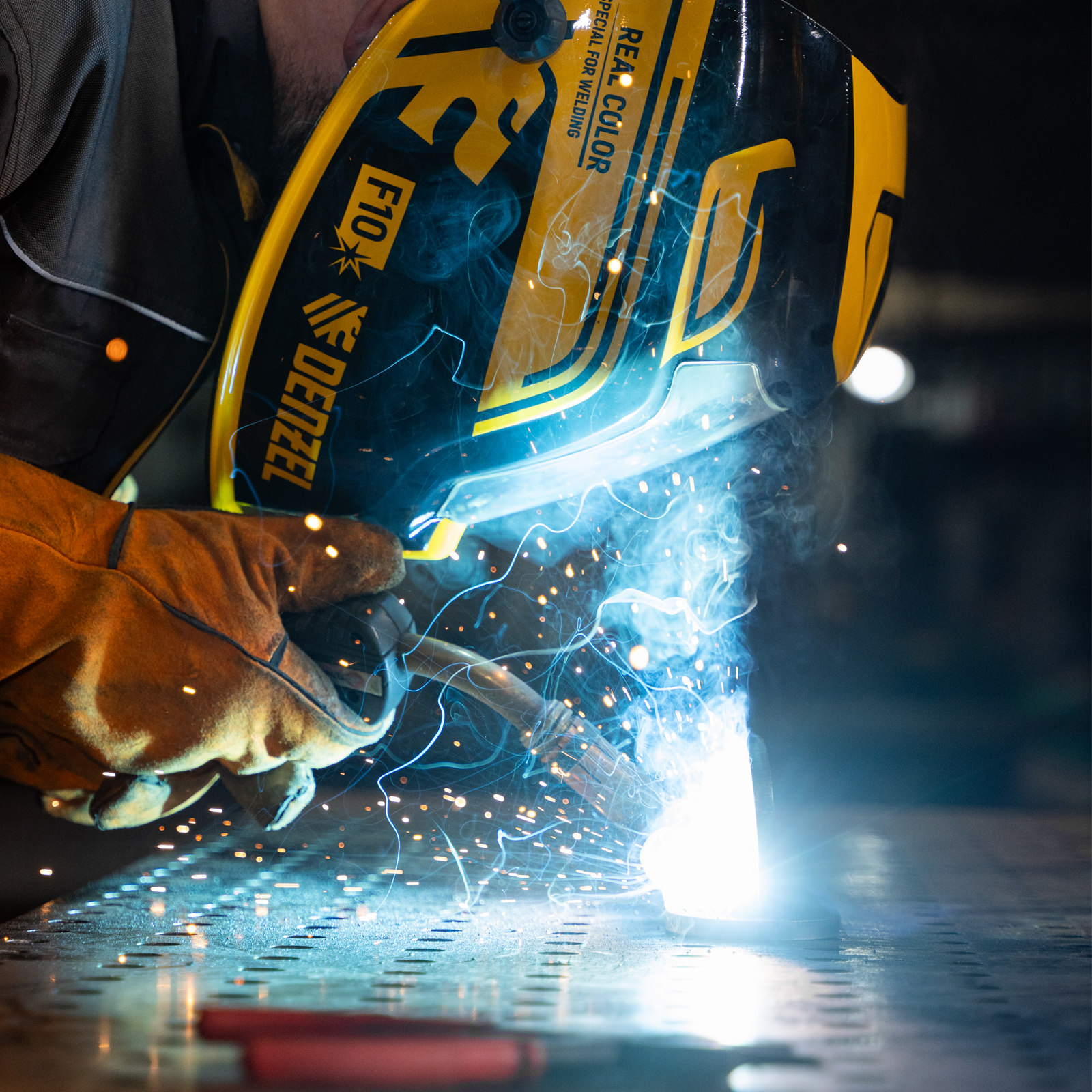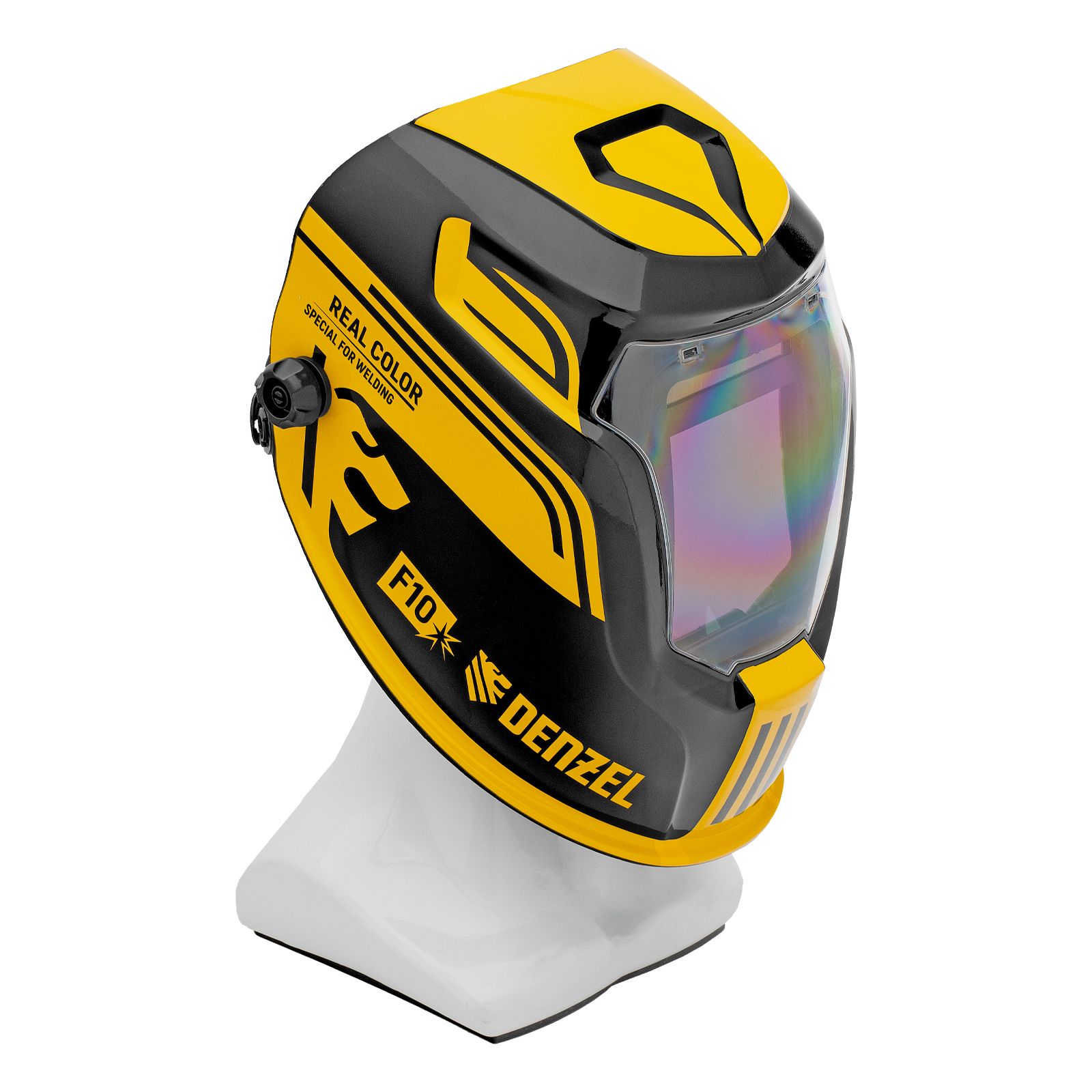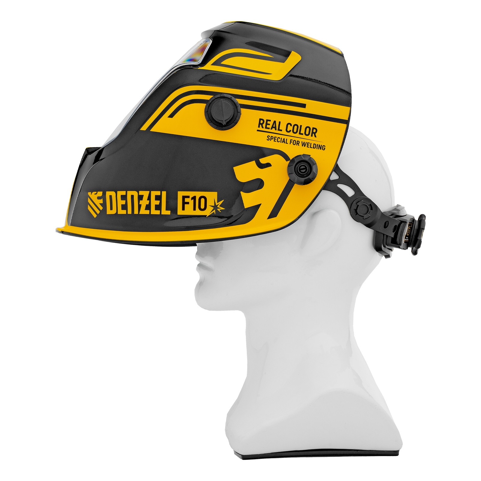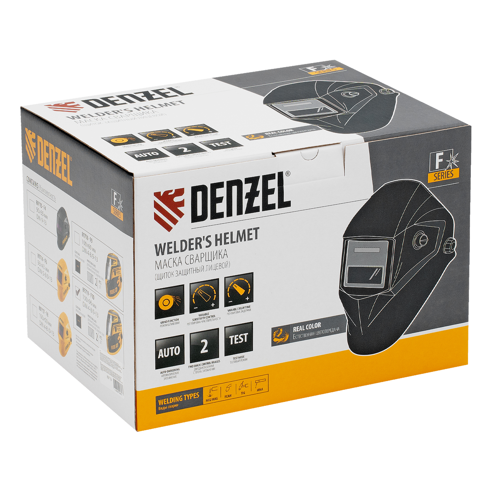 Защитный лицевой щиток (маска сварщика) Denzel F10 89719 со смотровым окном размером 100 x 96 мм, системой Real Color и функцией затемнения в диапазоне DIN 4-8/9-14, предназначен для защиты глаз, лица пользователя, области шеи и частично области плеч от искр, брызг расплавленного металла, а также инфракрасного и ультрафиолетового излучения. Используется во время проведения сварочных работ в различных режимах (MMA, MIG/MAG, TIG). 4 оптических датчика обеспечивают эффективную работу светофильтра. Благодаря системе «хамелеон» экран автоматически темнеет при поджиге дуги (время реагирования 1/25000 с) и светлеет после окончания сварки.