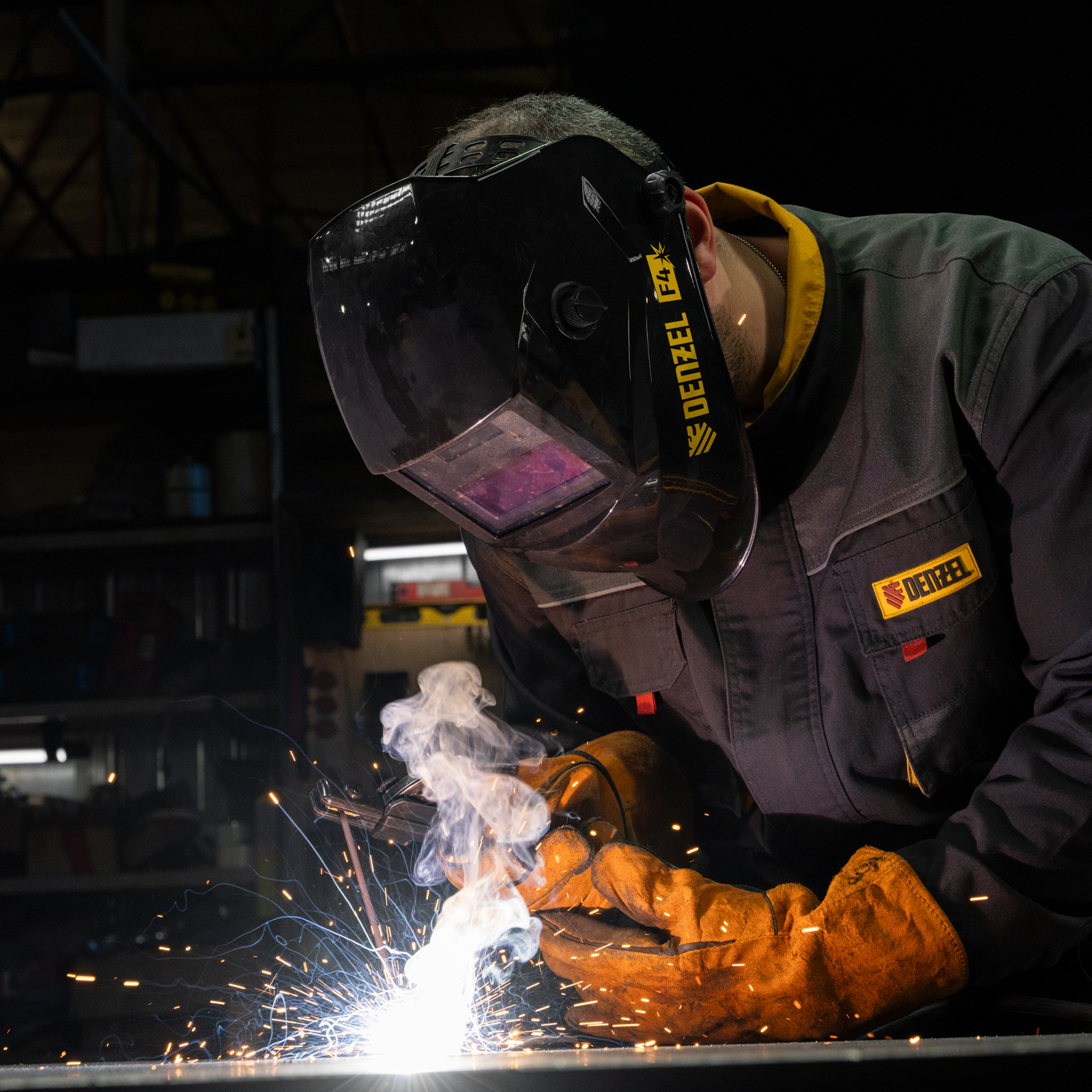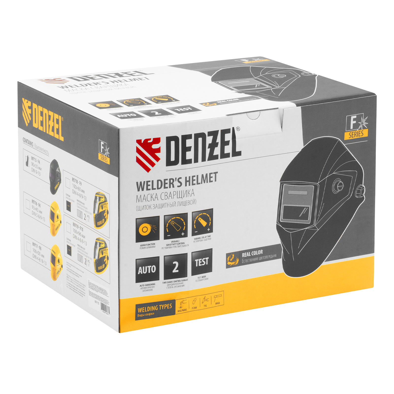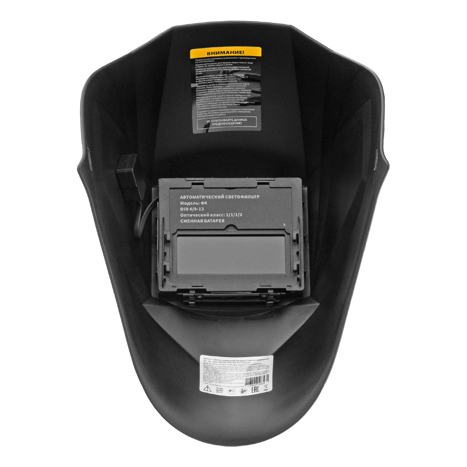 Защитный лицевой щиток (маска сварщика) Denzel F4 89715 со смотровым окном размером 90 x 35 мм и функцией затемнения DIN 4/9-13 используется во время проведения сварочных работ. Надежно защищает глаза и лицо пользователя от искр, брызг расплавленного металла, а также от инфракрасного и ультрафиолетового излучения. Корректную работу светофильтра обеспечивают два фотодатчика. Щиток подходит для проведения сварочных работ в режимах MMA, MIG/MAG, TIG, а также для выполнения плазменно-дуговой сварки, плазменной и дуговой резки.
