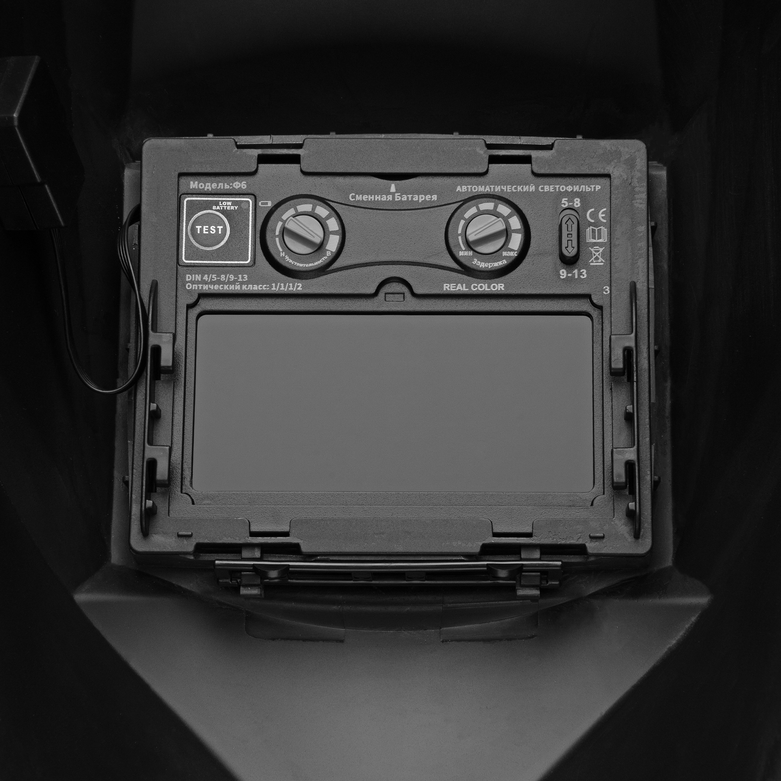 - Автономность — светофильтр темнеет при поджиге дуги и автоматически светлеет после окончания сварки, что позволяет осмотреть сварное соединение, не снимая маску.
