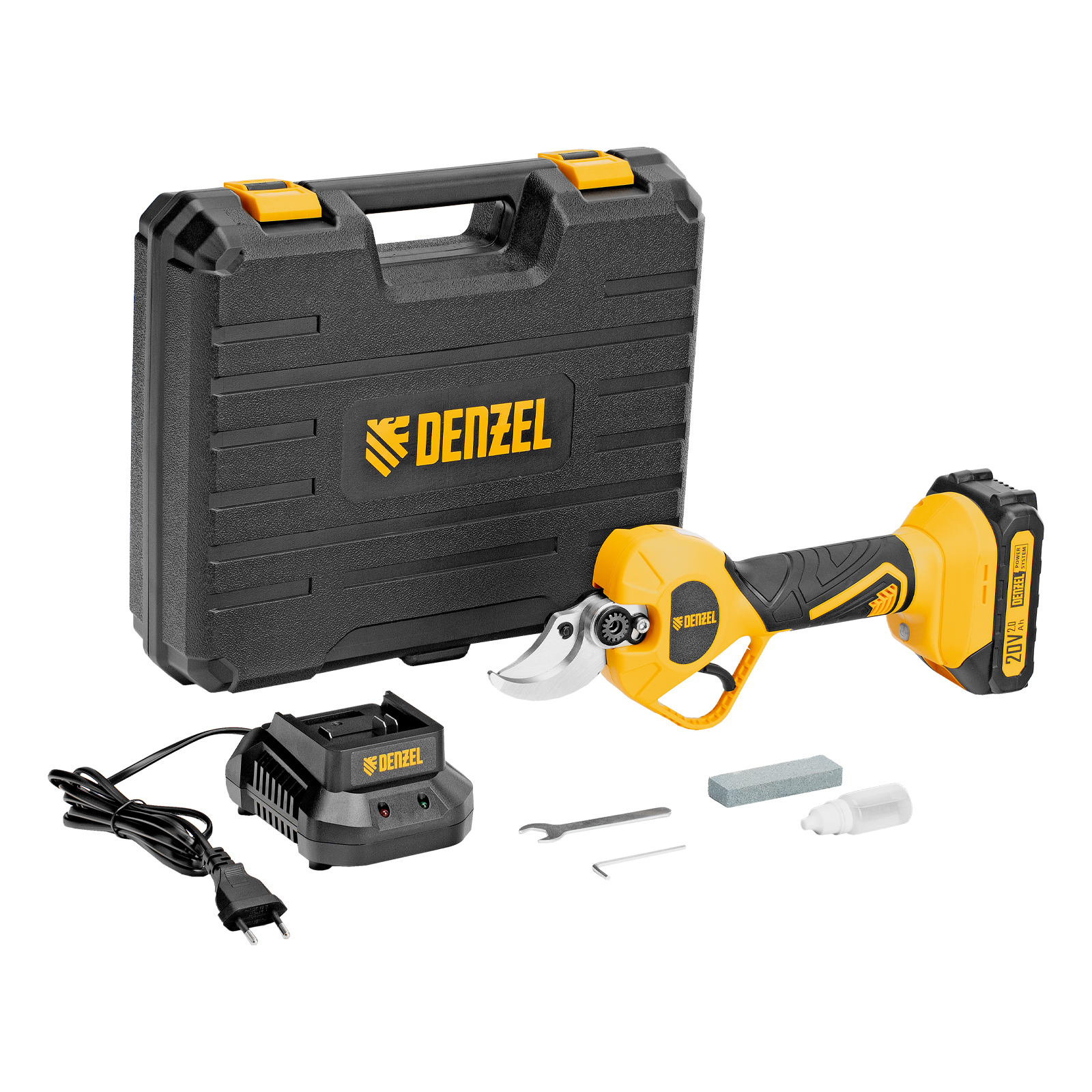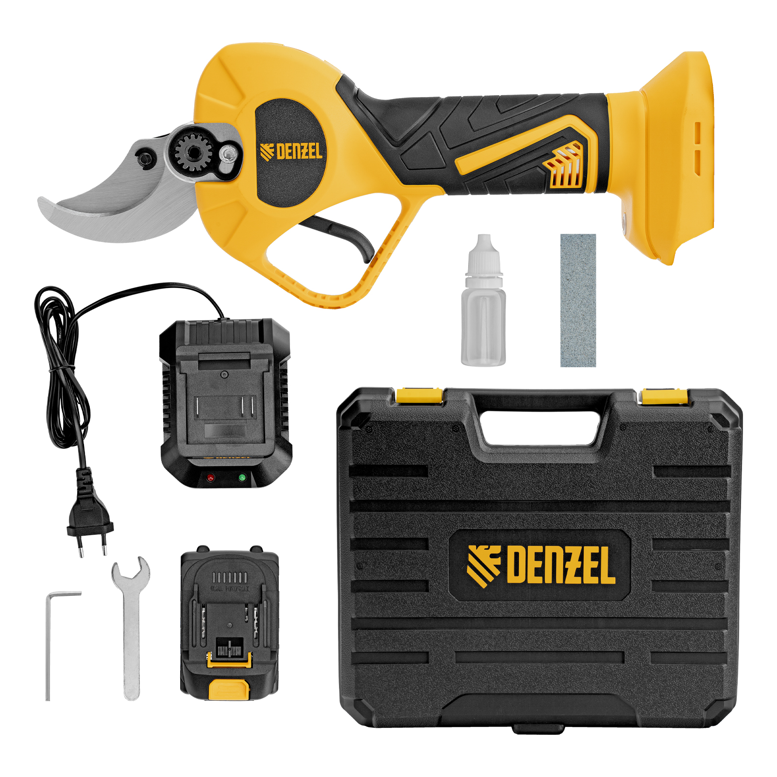 - Широкая комплектация — секатор поставляется с аккумулятором, зарядным устройством, гаечным и шестигранным ключами, масленкой и точильным камнем.