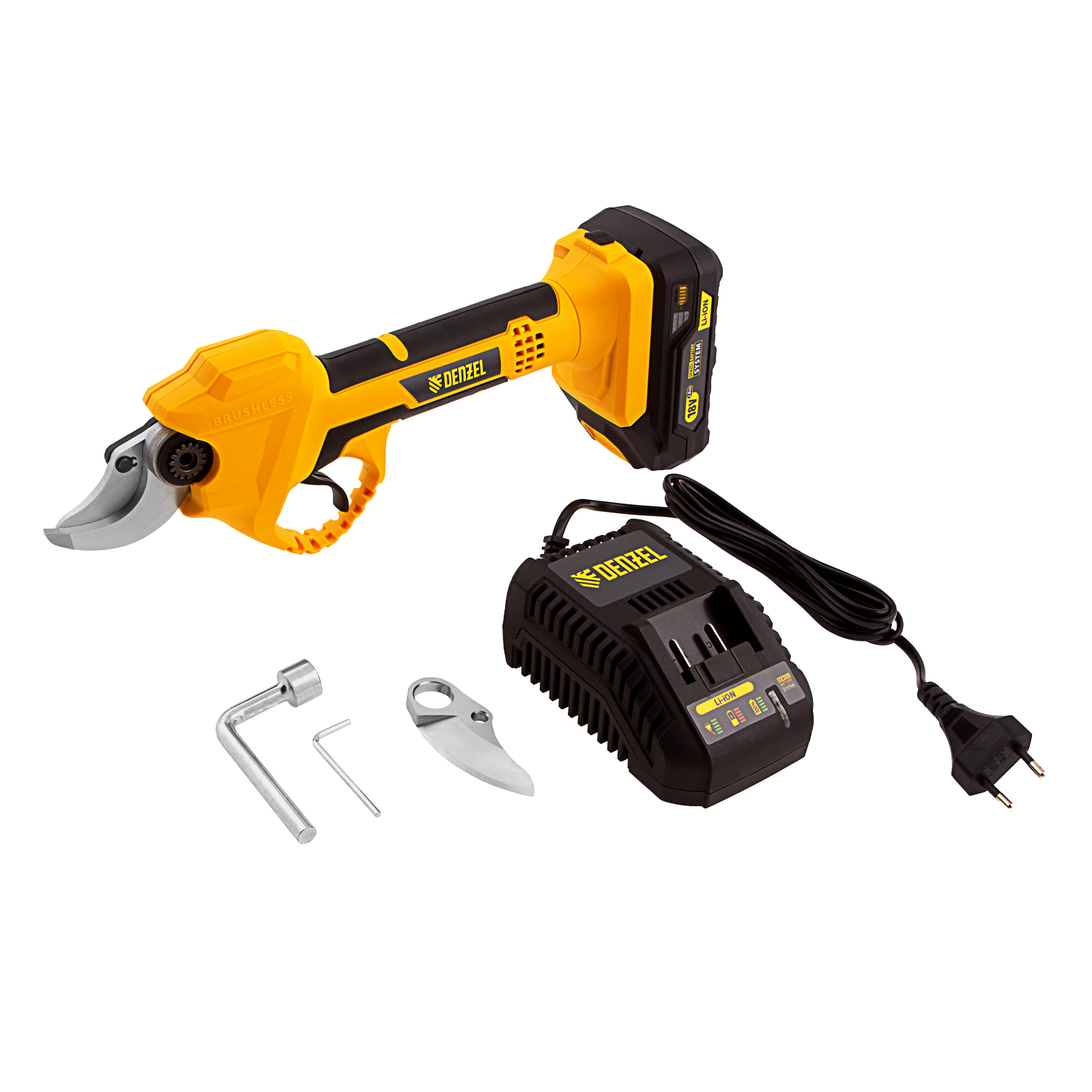 - Полный комплект поставки — аккумулятор и зарядное устройство прилагаются к секатору.