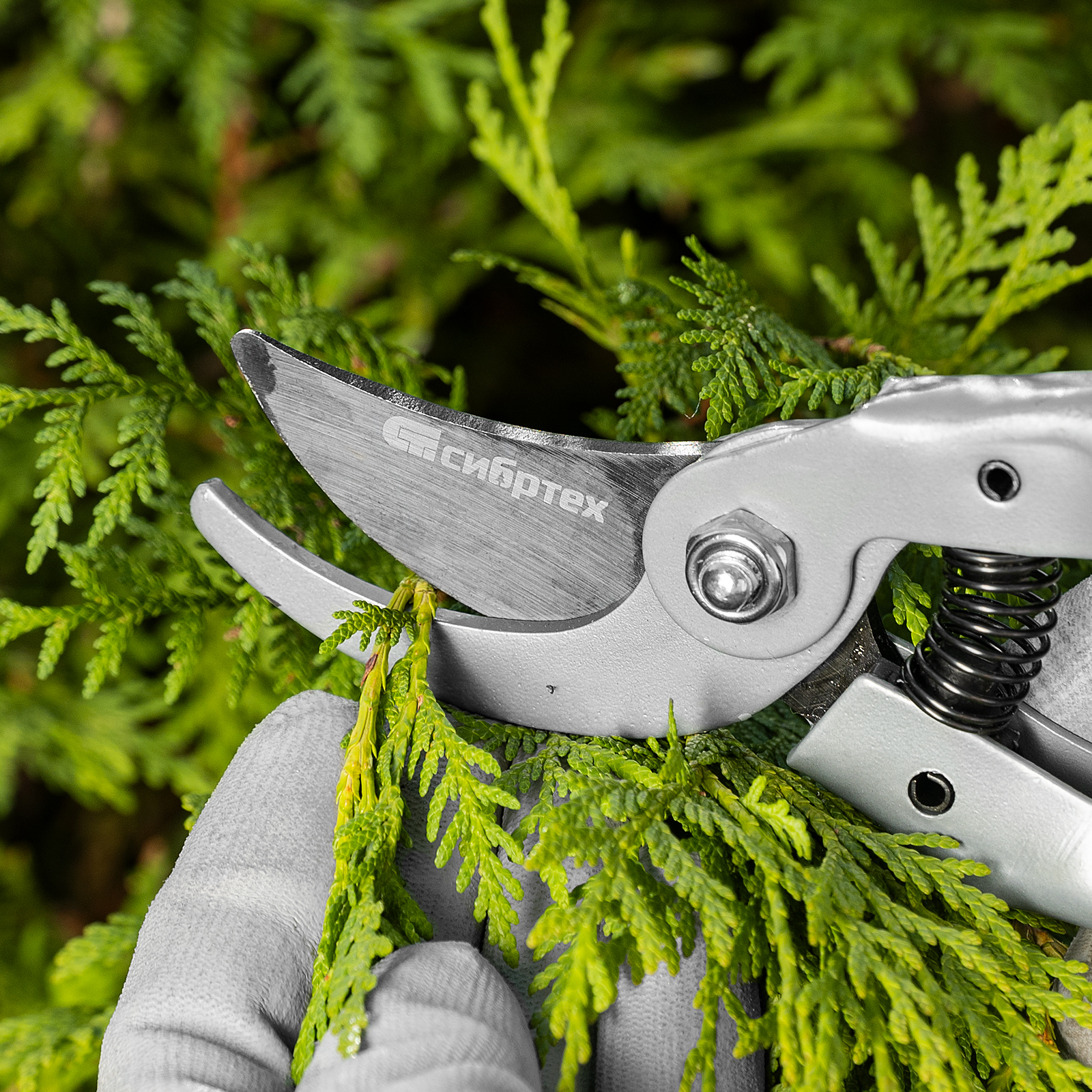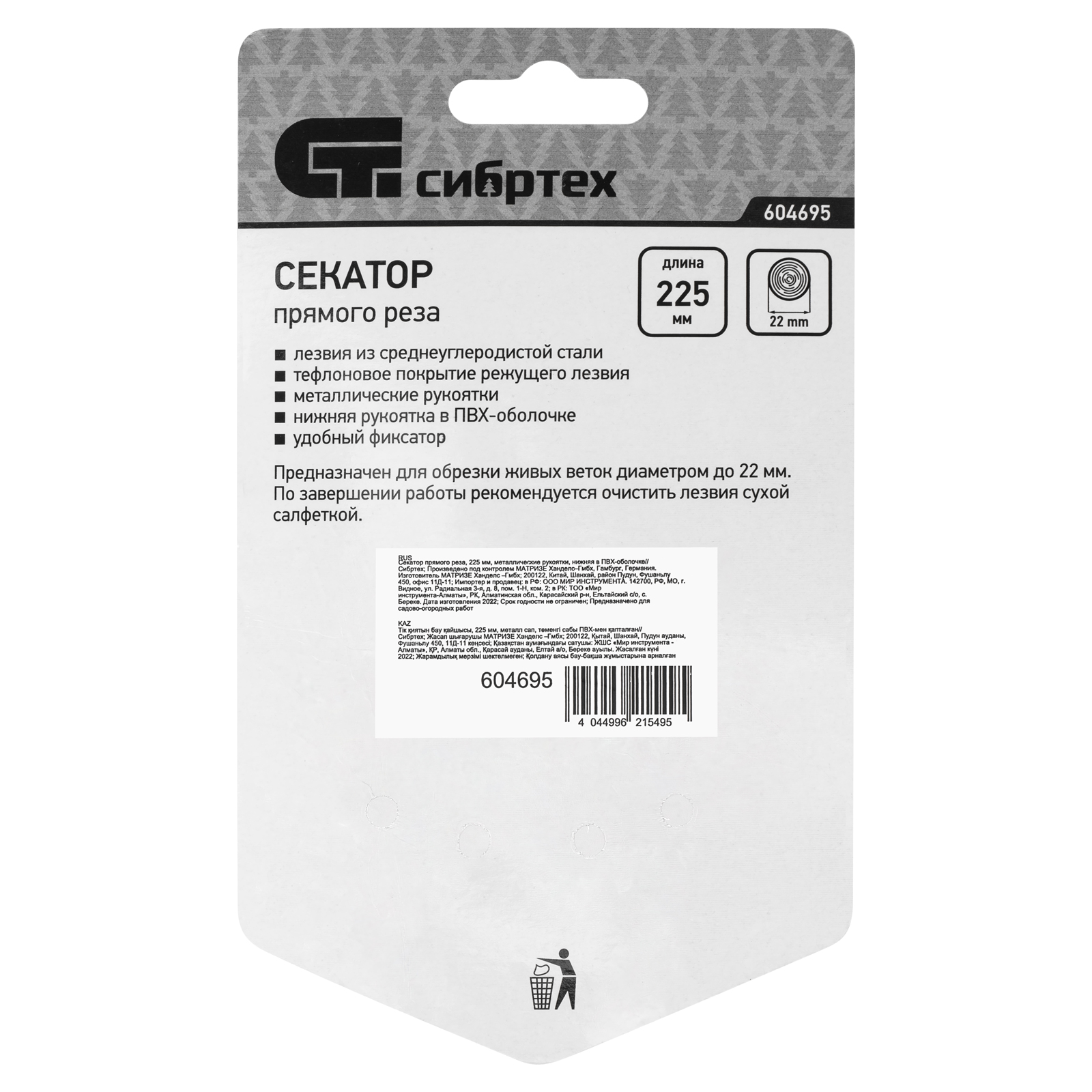 Секатор прямого реза Сибртех 604695 длиной 225 мм, с металлическими рукоятками (нижняя в ПВХ-оболочке), используется для обрезки живых веток толщиной до 22 мм. Срез получается гладким и аккуратным, поскольку лезвия перемещаются в параллельных плоскостях. Растению причиняется минимальный ущерб. Плотность примыкания лезвий можно регулировать при помощи винта. Секатор пригодится для ухода за растительностью на даче и в саду.