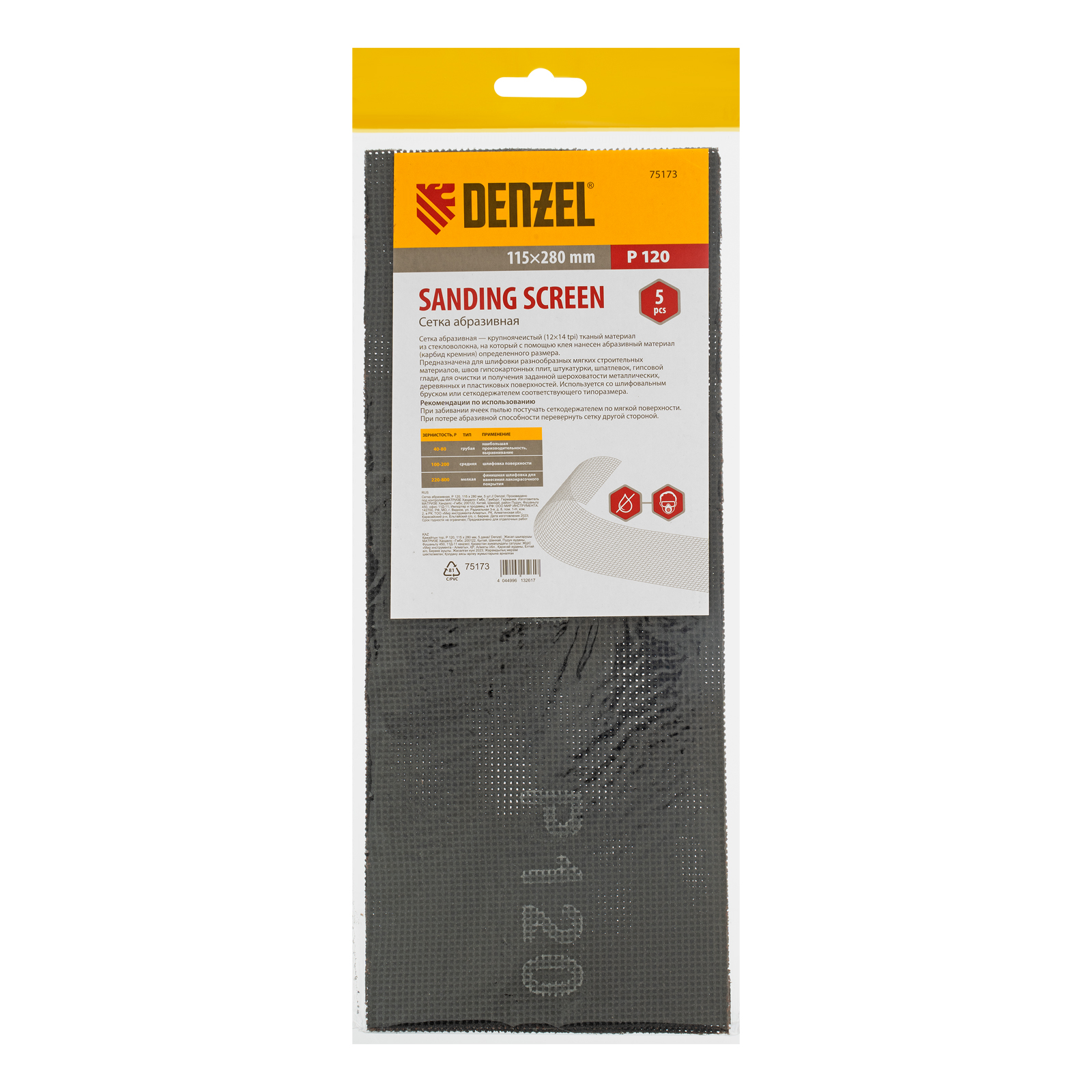 Абразивная сетка Denzel 75173 размером 115 х 280 мм, с зернистостью P 120, 5 шт. в упаковке, применяется для чистовой обработки и придания гладкости зашпаклеванным поверхностям, а также твердой древесине и металлу. Бережно снимает тонкий слой материала и лакокрасочного покрытия, удаляет ржавчину и заусенцы, сглаживает неровности. Обладает высоким ресурсом, т.к. заостренные зерна карбида кремния стачиваются медленно. Сетку устанавливают на ручное шлифовальное приспособление — брусок или сеткодержатель соответствующего типоразмера.