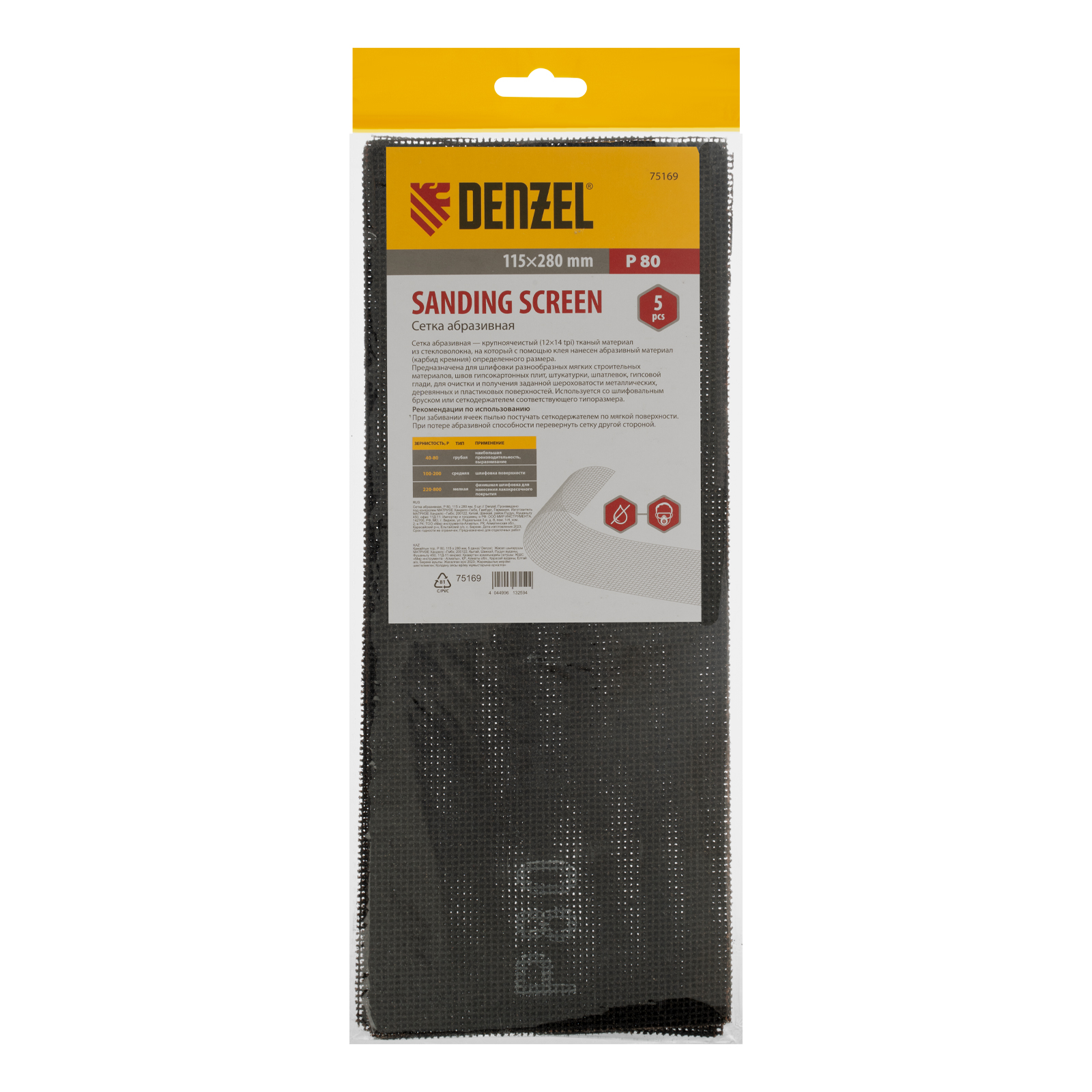 Абразивная сетка Denzel 75169 размером 115 х 280 мм, с зернистостью P 80, 5 шт. в упаковке, используется для промежуточной шлифовки деревянных, каменных, шпаклеванных и металлических поверхностей. Абразив P 80, состоящий из частиц карбида кремния, успешно справляется с удалением верхнего слоя материала и ржавчины, снятием лакокрасочных покрытий, сглаживанием заусенцев. Сетка совместима с ручными шлифовальными приспособлениями — брусками и сеткодержателями соответствующего типоразмера.