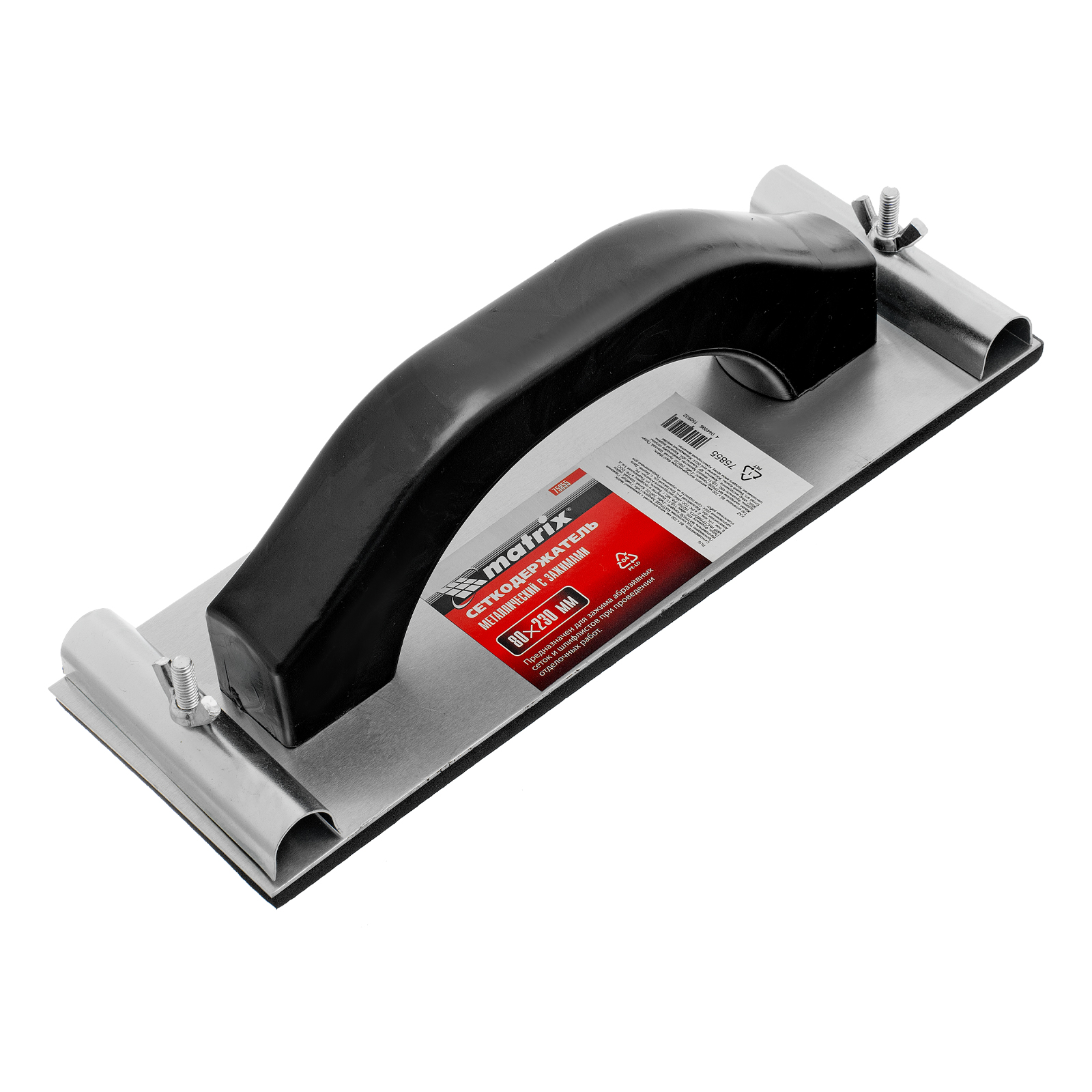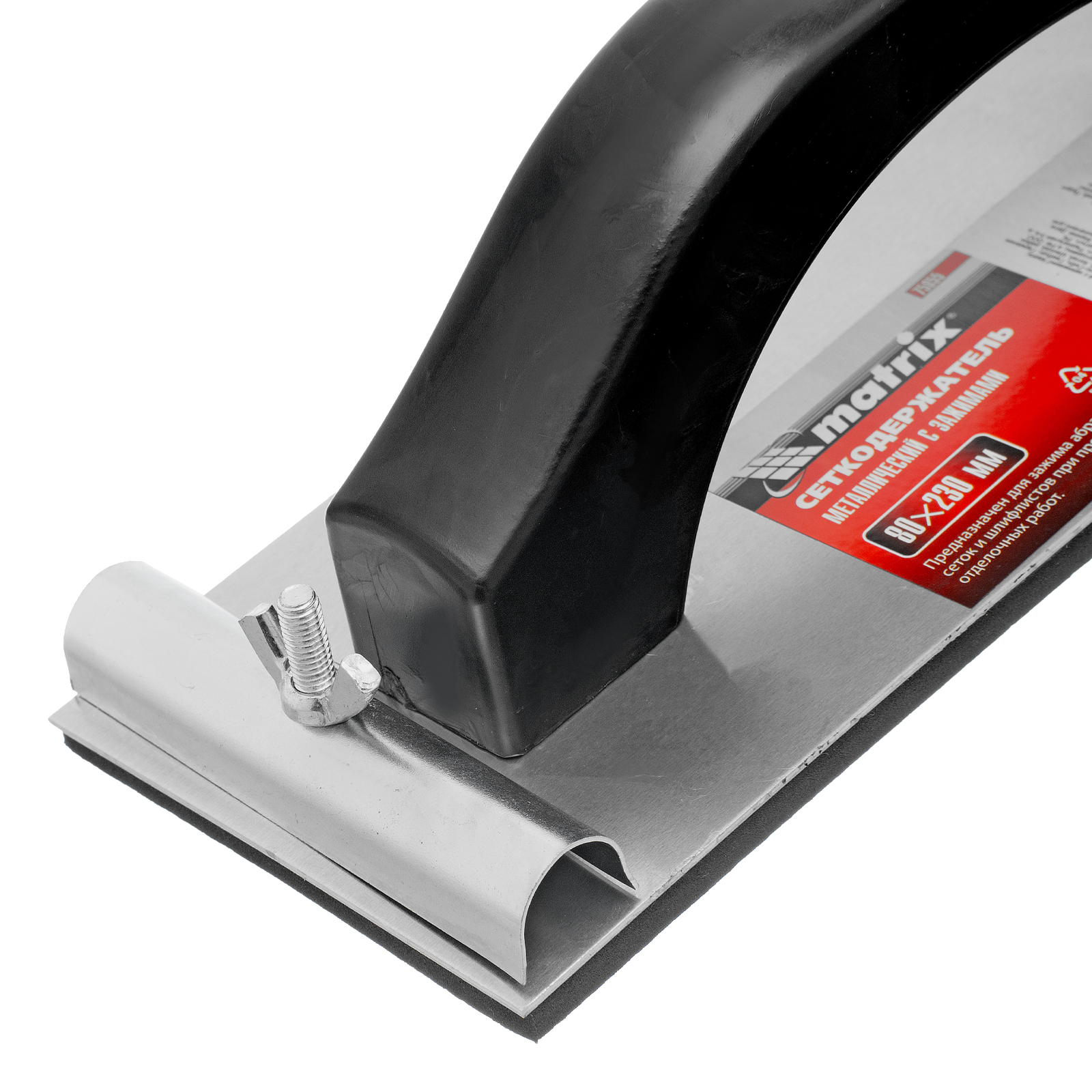 <p>Металлический сеткодержатель Matrix 75855 с подошвой 80 х 230 мм, с зажимами, используется для ручного шлифования деревянных, шпатлеванных, металлических, пластмассовых и прочих твердых поверхностей. Сеткодержатель фиксирует абразивную стеклосетку или шлифлист и позволяет удалять старые отделочные покрытия, подготавливать поверхность под покраску, а также выполнять чистовую обработку.</p><h2>Преимуществ</h2><ul><li>Прочность — корпус из алюминиевого сплава устойчив к повреждениям в случае небольших ударов и случайных падений.</li><li>Износостойкость — подошва из вспененного каучука EVA отлично держит форму и не боится перепадов температуры.</li><li>Надежная фиксация абразивного материала — благодаря винтовым зажимам сетка или шлифлист не смещается во время работы.</li><li>Комфортная работа — удобная ручка обеспечивает надежный хват.</li></ul>