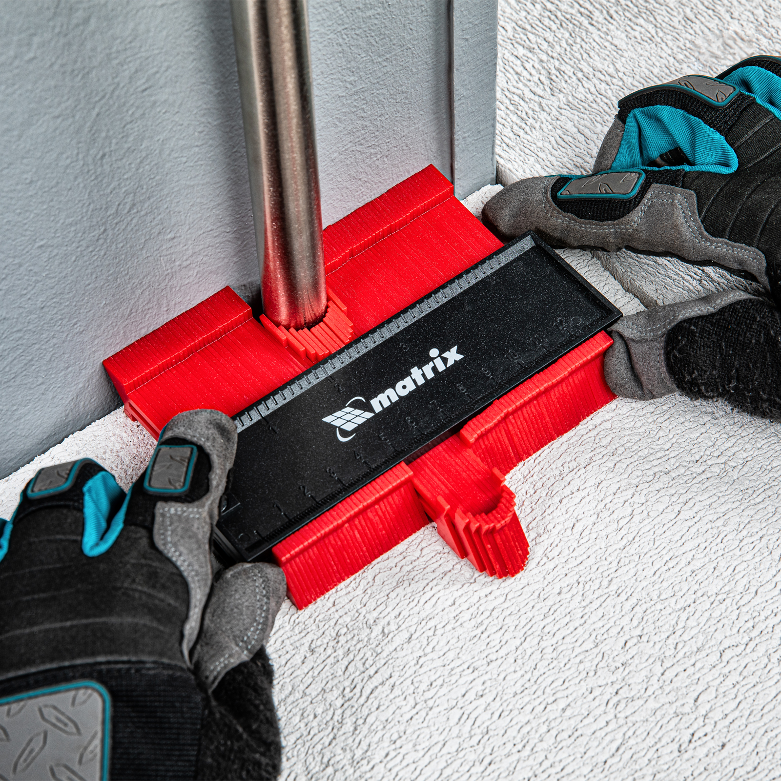 Пластиковый шаблон для копирования профиля Matrix 88103 предназначен для копирования и переноса контуров различных форм. Шаблон необходим для точной подрезки отделочных материалов (ламината, линолеума, кафельной плитки, гипсокартона и др.) при обходе труб водоснабжения, углов и других рельефных препятствий. Перенос контуров осуществляется при помощи выдвижных пластиковых пластин. Шаблон оснащен измерительной шкалой длиной 12 см.