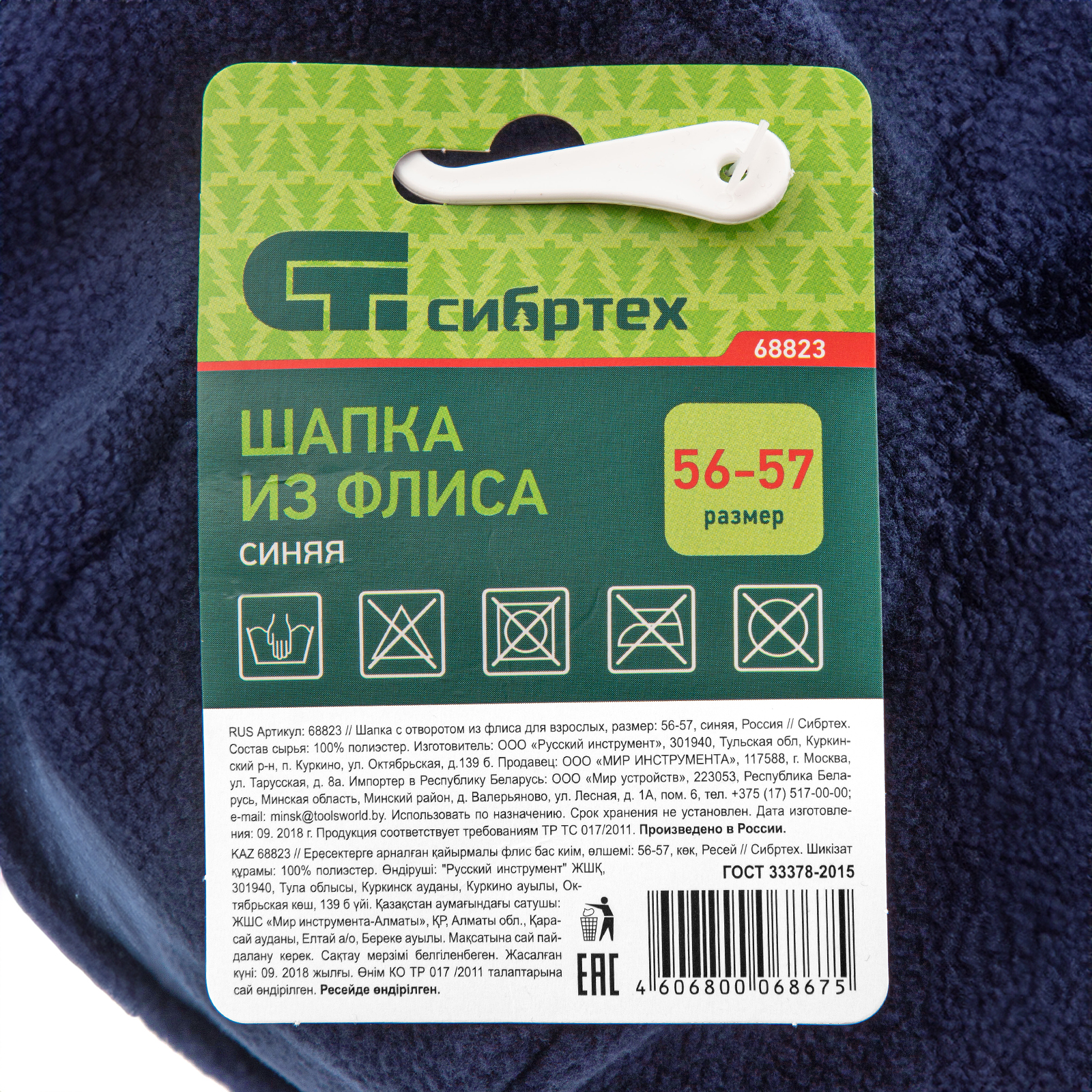 Шапка из флиса для взрослых Сибртех 68823 синего цвета, с отворотом, размера 56-57, предназначена для защиты головы от холода. Изготовлена из эластичного материала, легко тянется и быстро надевается. Отворот обеспечивает более плотную посадку шапки на голове. Шапка пригодится во время работы вне помещения, а также для прогулок в городе и на природе.