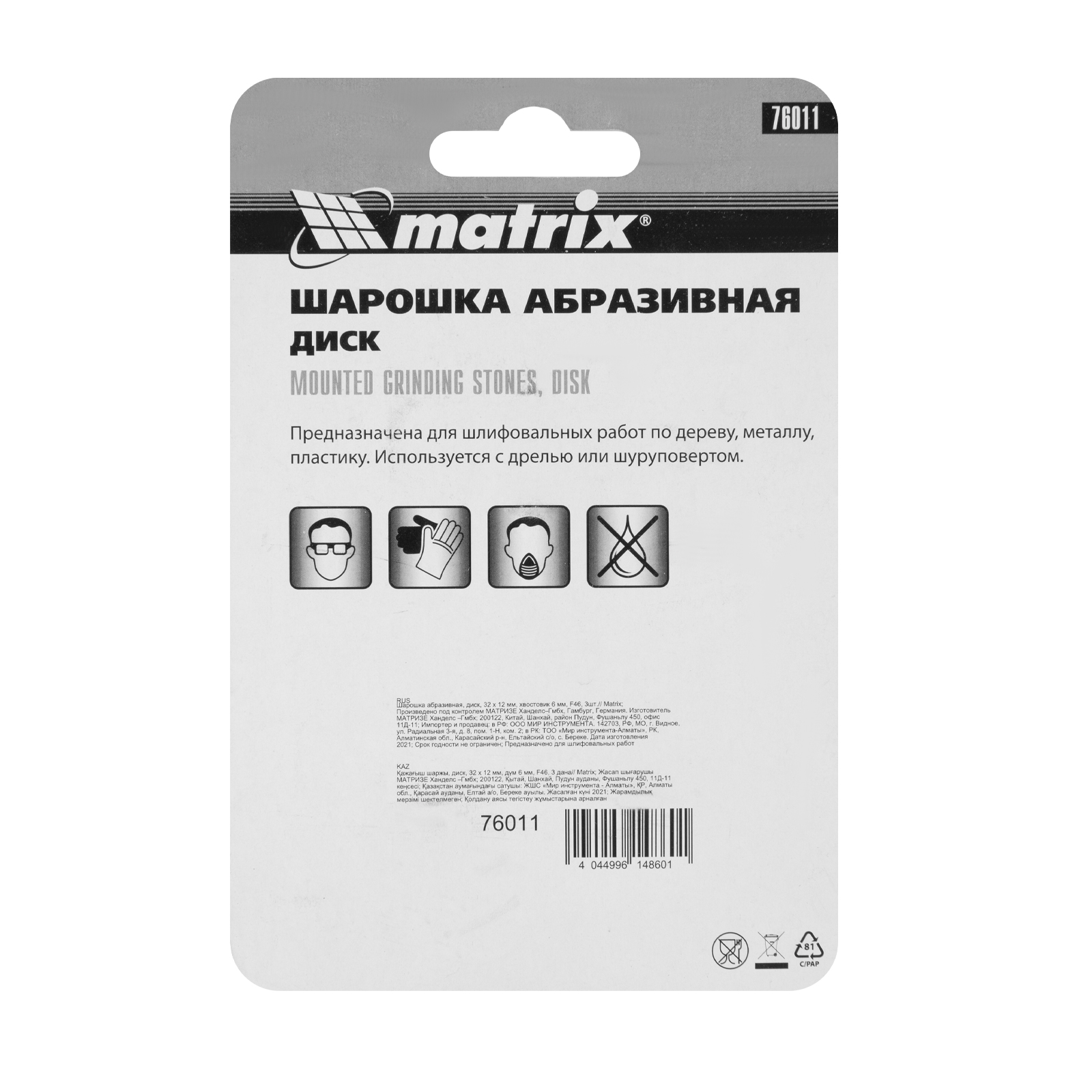 <p>Шарошка абразивная Matrix 76011, 32 х 12 мм, с абразивом F46 и диаметром хвостовика 6 мм — набор из 3 дисков, рассчитанный на бытовое и профессиональное применение. Используется в качестве оснастки на дрелях, шуруповертах, а также ПШМ, позволяет снимать фаски, удалять заусенцы и производить другие работы на различных поверхностях. Дисковые шарошки пригодятся при осуществлении отделочных и декоративных работ.</p><h2>Преимущества</h2><ul><li>Абразив из оксида алюминия — шарошка подходит для обработки различных материалов: металла, пластика, древесины, природного и искусственного камня.</li><li>Крупнозернистый абразив F46 — с помощью шарошки можно произвести грубую шлифовку заготовок.</li><li>3 шарошки в комплекте — их хватит на большой объем работ.</li></ul>