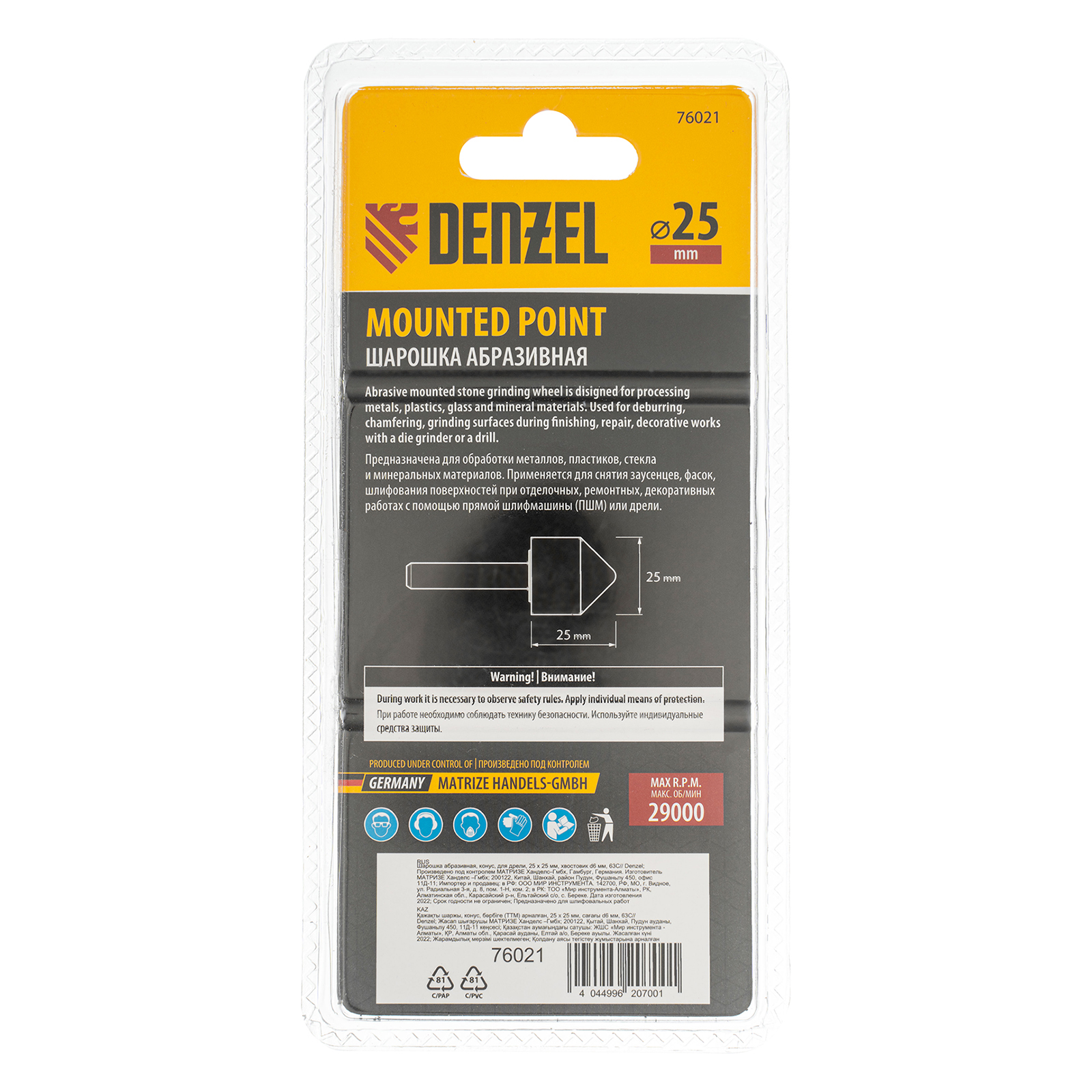 Шарошка абразивная Denzel 76021 с рабочей частью в форме конуса 25 х 25 мм, с хвостовиком диаметром 6 мм, — оснастка для дрели, шуруповерта или прямошлифовальной машины (ПШМ). Используется для снятия заусенцев, фасок, ржавчины, шлифования поверхности. Удобна для обработки цилиндрических и конических отверстий. Пригодится при выполнении ремонтных, отделочных и кузовных работ.