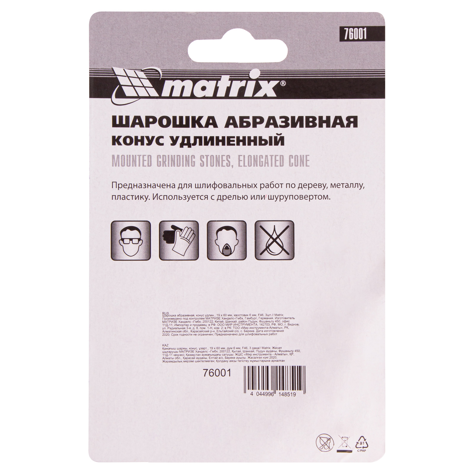 Шарошка абразивная Matrix 76001 размером 19 х 60 мм, с цилиндрическим хвостовиком 6 мм, 3 шт., имеет форму удлиненного конуса с абразивом зернистостью F46. Она устанавливается в качестве оснастки на дрель или шуруповерт. Позволяет зачищать отверстия, снимать фаски и удалить заусенцы. Шарошка рассчитана на бытовое и профессиональное применение.