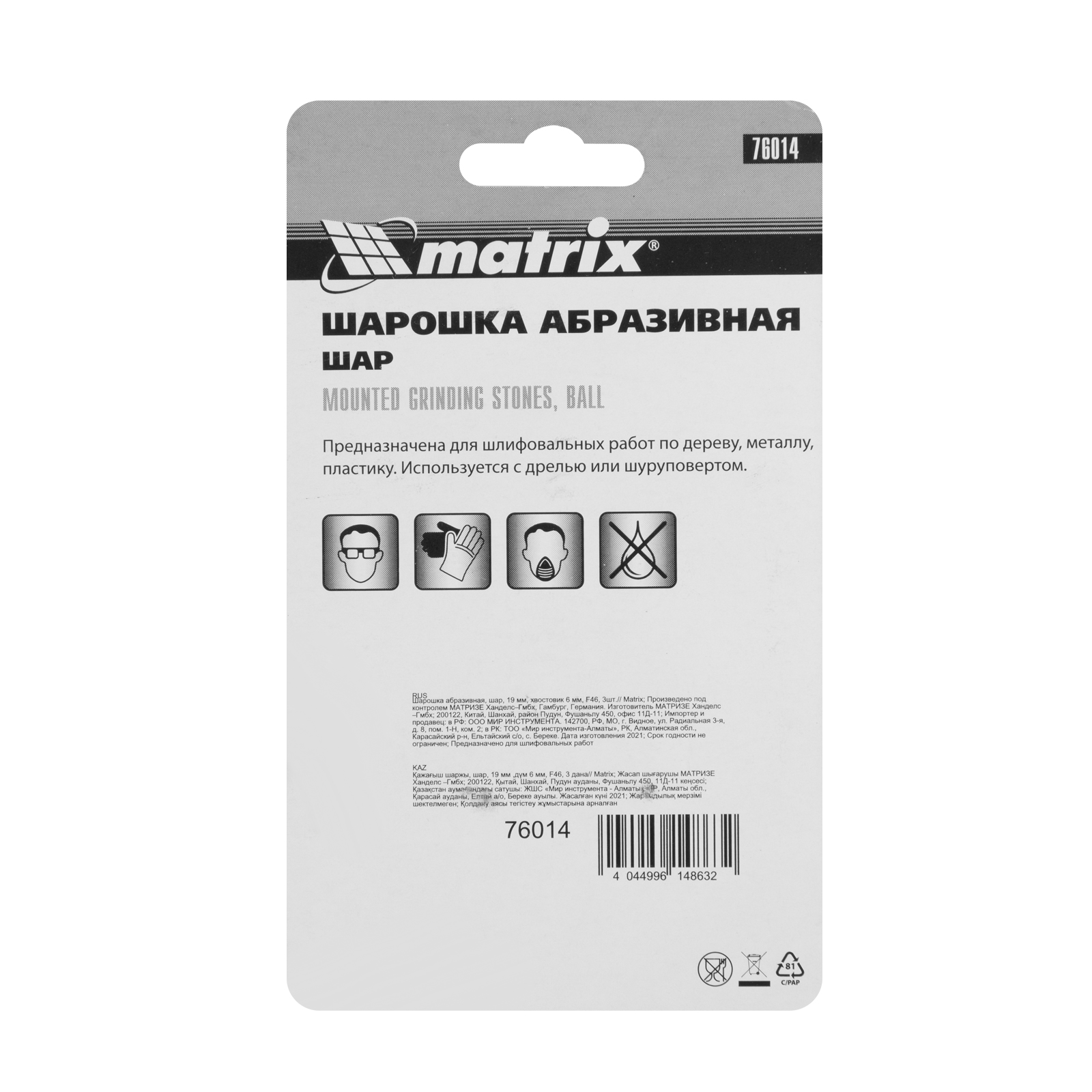 Шарошка абразивная Matrix 76014 зернистостью F46 выполнена в форме шара диаметром 19 мм с хвостовиком диаметром 6 мм. Используется в качестве оснастки на дрелях и шуруповертах, а также ПШМ при проведении столярных, ремонтных, строительных работ. Благодаря головке в форме шара шарошка может снять фаску и заусенцы, зачистить детали со сложной формой.