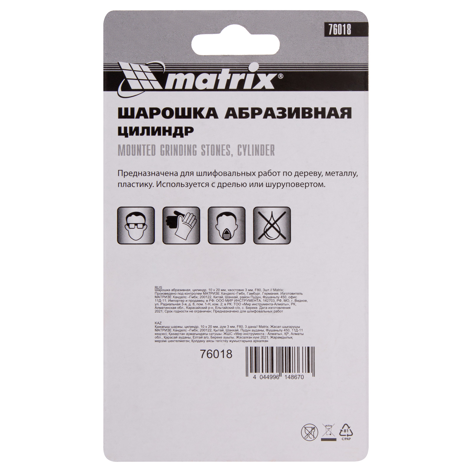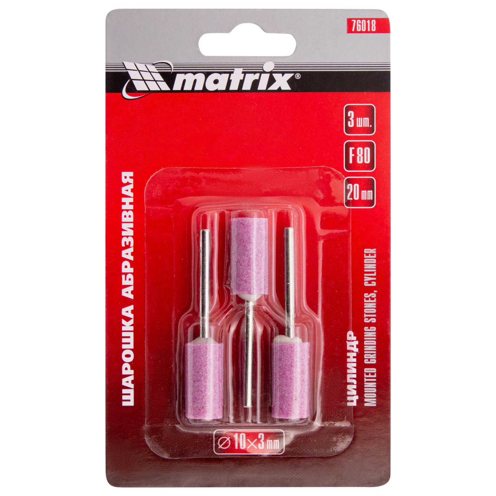 <p>Шарошка абразивная Matrix 76018, 10 х 20 мм, с хвостовиком диаметром 3 мм, 3шт., имеет форму цилиндра и покрыта среднезернистым абразивом F80. Предназначена для очистки прямолинейных поверхностей, расширения отверстий, снятия фасок и удаления заусенцев. Она используется в качестве оснастки на дрелях, шуруповертах, а также ПШМ при выполнении отделочных и декоративных работ.</p><h2>Преимущества</h2><ul><li>Абразив из оксида алюминия универсален по своему применению, поэтому подходит для обработки различных поверхностей: металла, пластика, древесины, минеральных материалов.</li><li>Среднезернистый абразив F80 позволяет осуществить чистовую шлифовку заготовок.</li><li>Комплект состоит из 3 шарошек, которых хватит на большой объем работ.</li></ul>