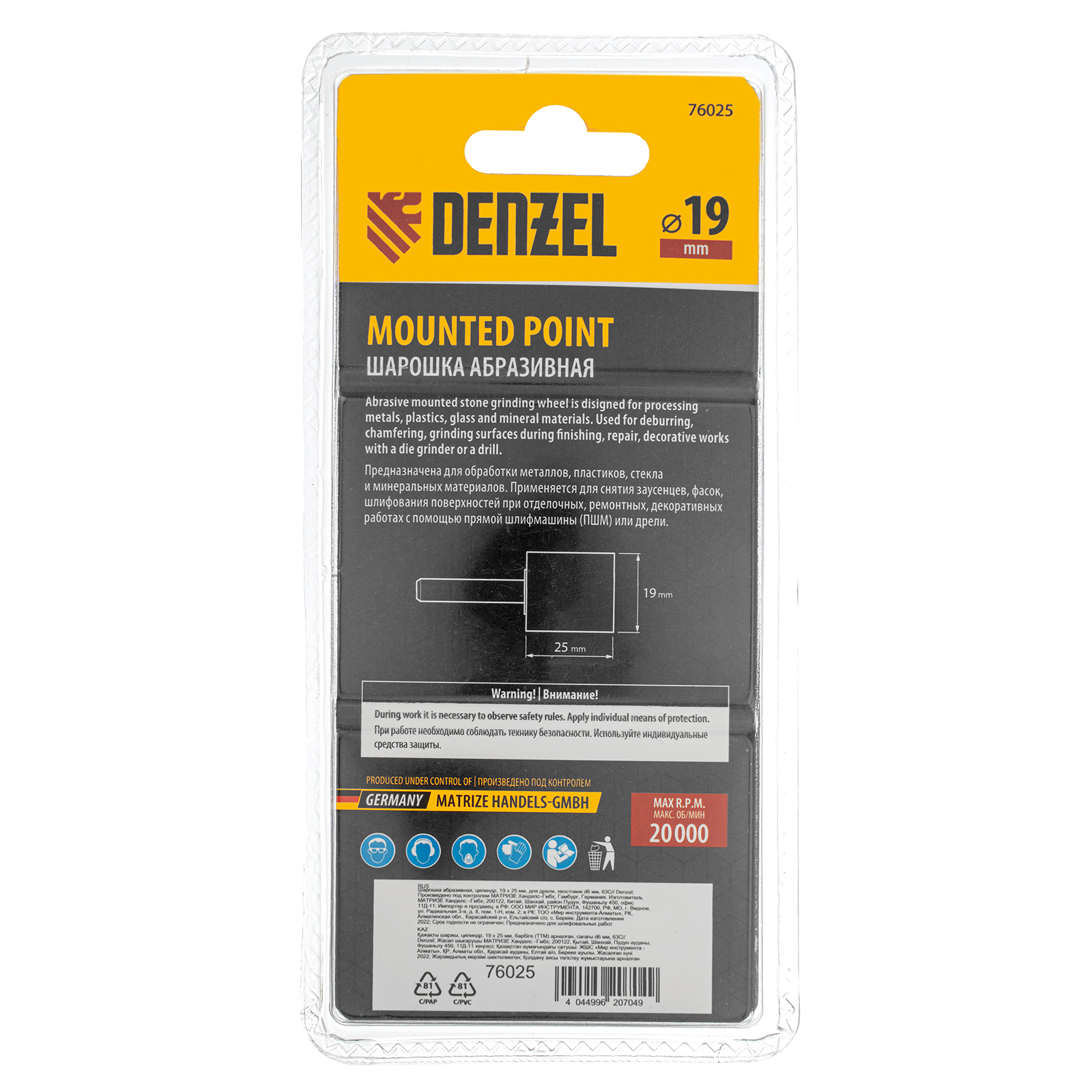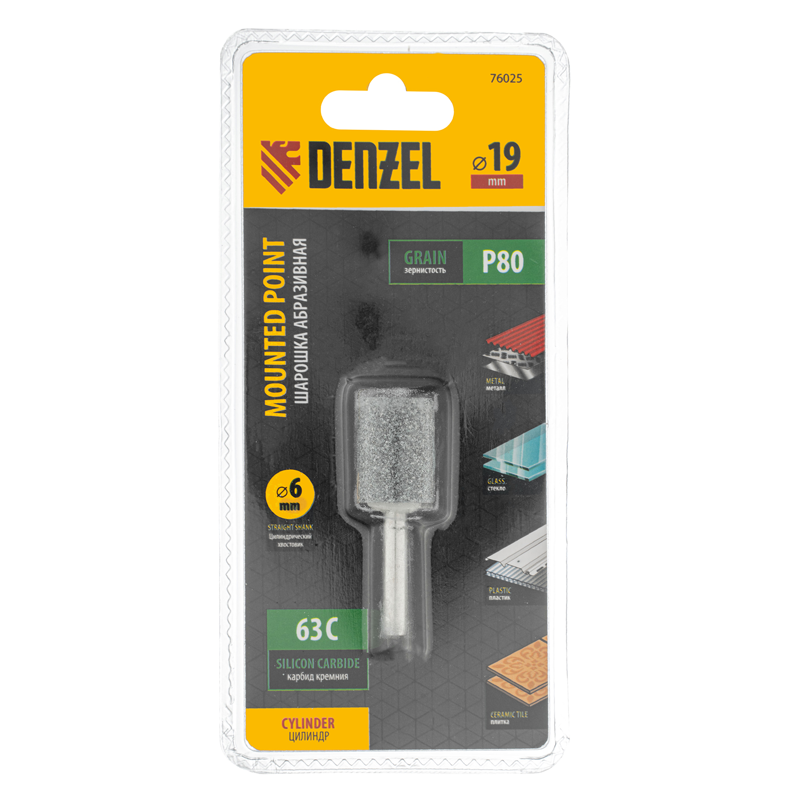 <p>Шарошка абразивная Denzel 76025 с рабочей частью в форме цилиндра 19 х 25 мм, с хвостовиком диаметром 6 мм, устанавливается на дрель, шуруповерт или или прямошлифовальную машину (ПШМ). Удобна для зачистки ровных поверхностей, обработки сварных швов, удаления заусенцев, снятия фасок, а также для расширения отверстий и заточки лезвий режущих инструментов. Будет полезна при выполнении ремонтных, кузовных, отделочных работ.</p><h2>Преимущества</h2><ul><li>Долговечность — абразив из карбида кремния (63С) обладает в 2 раза большим ресурсом, чем оксид алюминия.</li><li>Универсальность — шарошка подходит для обработки металла, пластика, различных сплавов, стекла, керамической плитки, натурального и искусственного камня.</li><li>Простое использование — цилиндрический хвостовик подходит для стандартных патронов дрелей и шуруповертов, а также для ПШМ с цанговым зажимом.</li></ul>